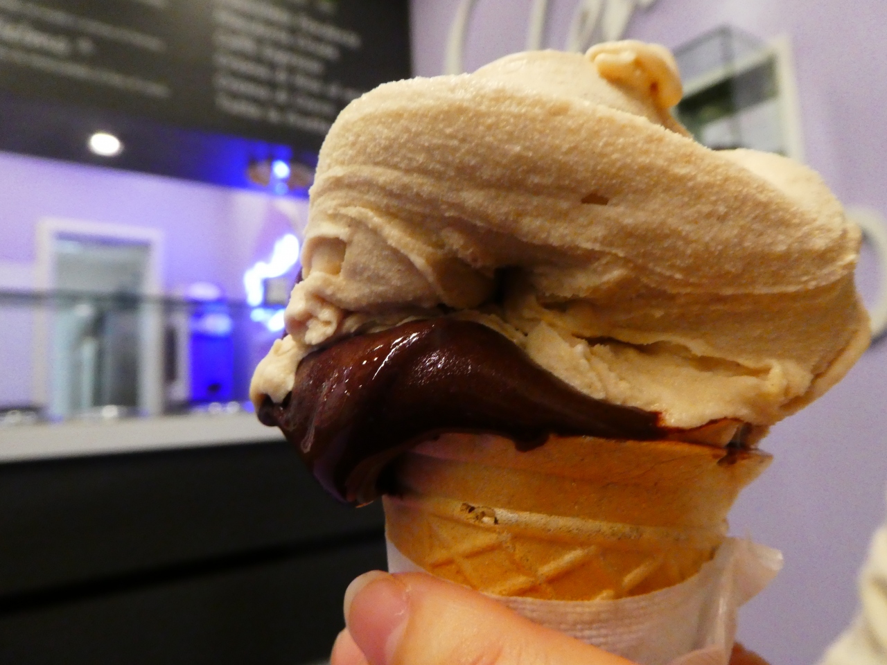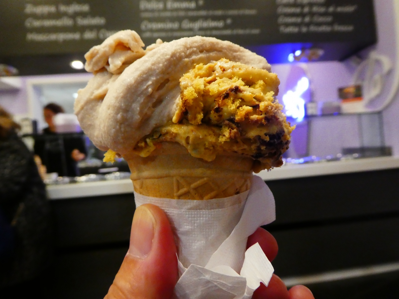 世界一おいしいジェラート屋さんとのネット情報を見つけ、せっかくなので行ってみました。斜塔から徒歩12分くらいと少し離れています。この時は一番安いサイズのジェラートを注文。一番安いものでも、2種類のフレーバーを選べます。チョコはとても濃厚。マロンは栗のうまさがぎゅっとしていて、いずれもおいしかったです。