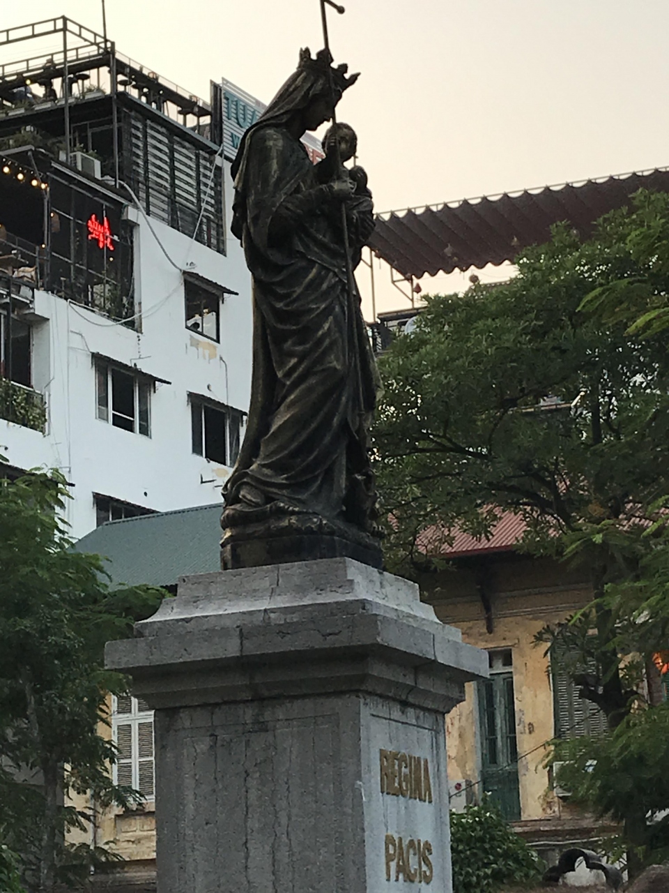 ベトナムが フランス領だった歴史を感じさせる フランス風のカトリック教会です。教会前の広場には とても大きな聖母子像が有ります。時間によっては 隣の学校の送迎バイクが沢山集まり気を付けないとちょっと危ないです。これもまた 今のベトナムの日常を感じさせます