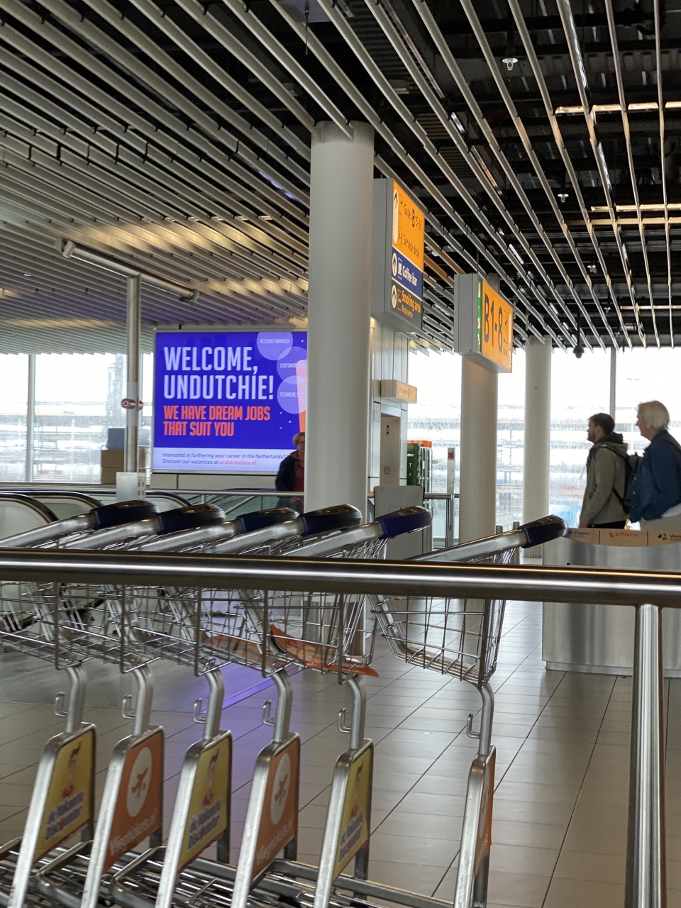 アムステルダムの空港ですが、非常に使いやすいです。ほぼ段差もありませんし、トイレも広くて荷物があっても安心です。また、アクセスも電車が地下からオランダの主要都市に出ていますし、国際電車もあります。また、切符も外国発行のクレジットカードでも難なく使えます。