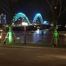 ロン橋のロンは「龍」の意味だそうです。幅の広い川を龍が体をくねらせてわたっているようにも見えます。陽が落ちると きれいにライトアップされ 色が次々変わっていました。頭の方からほ 火を吐くパフォーマンスが 決まった時間に あるそうです