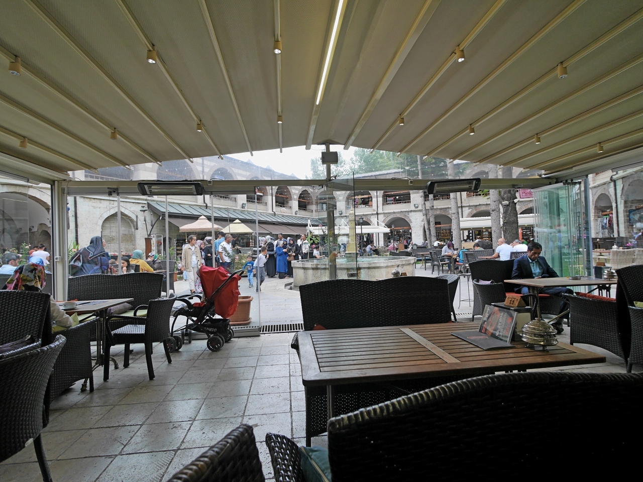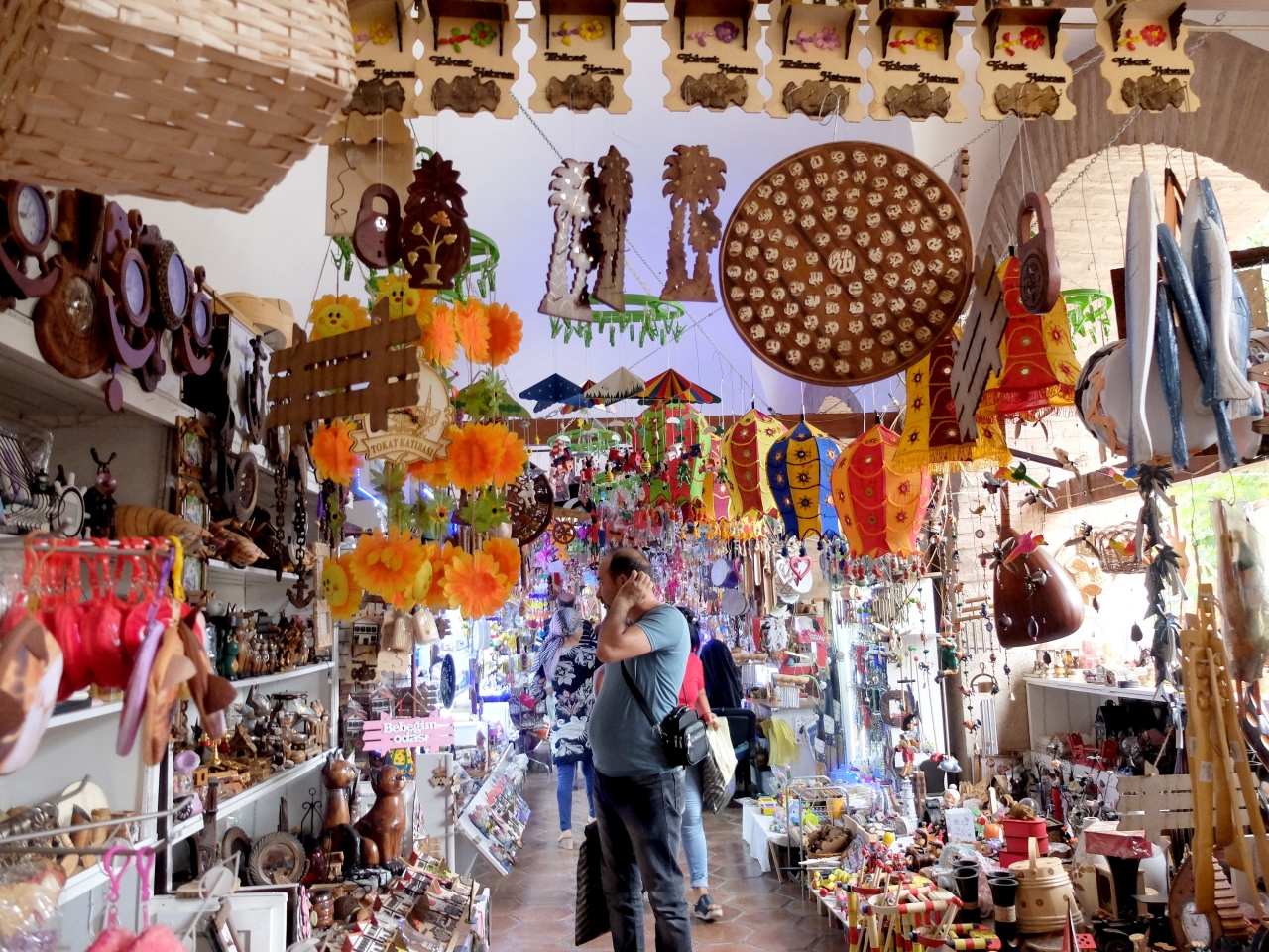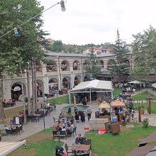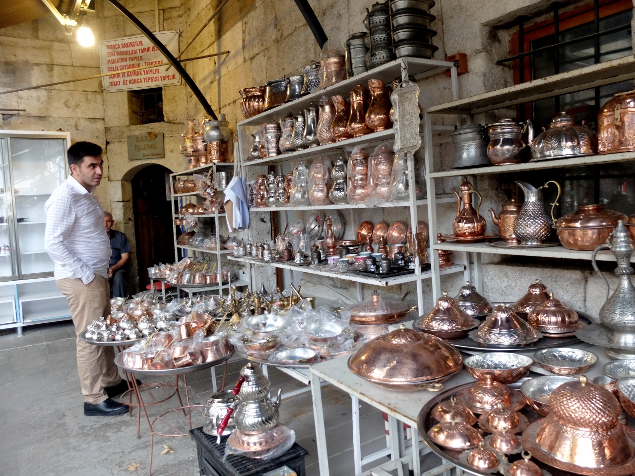 隊商宿の跡だ.いまはお土産物屋やアトリエが入っている.同僚たちは目を輝かせ買い物三昧 私は一通り見学した後,伝統的トルココーヒーでゆっくりする.最後に銅製品の店に.手前は安いが,あまりいいものはない.奥は若干高いがなかなかいいものがあった.同僚は小さなフライパンを購入.私は銅製のカップをお土産に買った.アラビアンナイトの世界を髣髴とする建物 買い物も楽しい