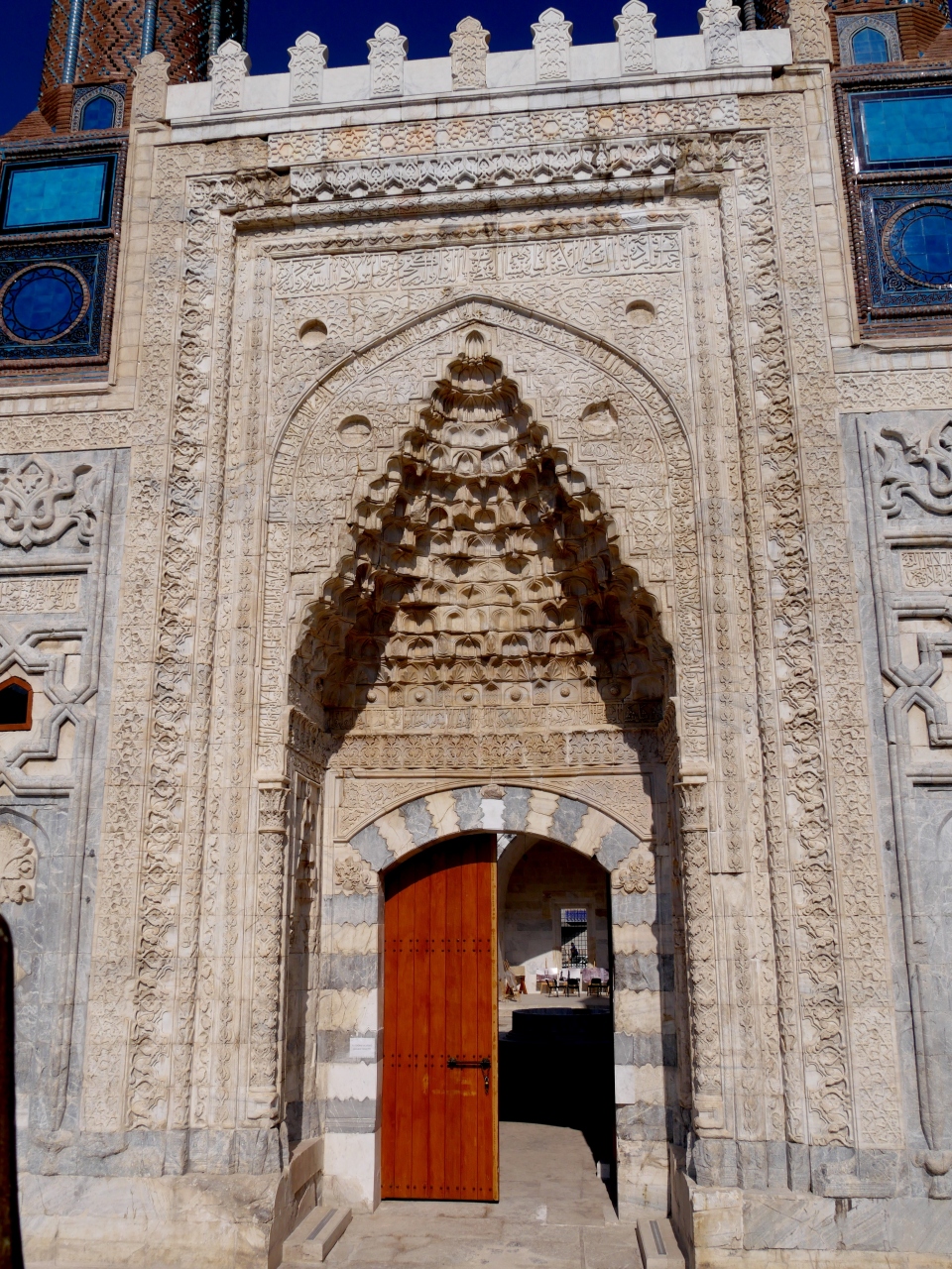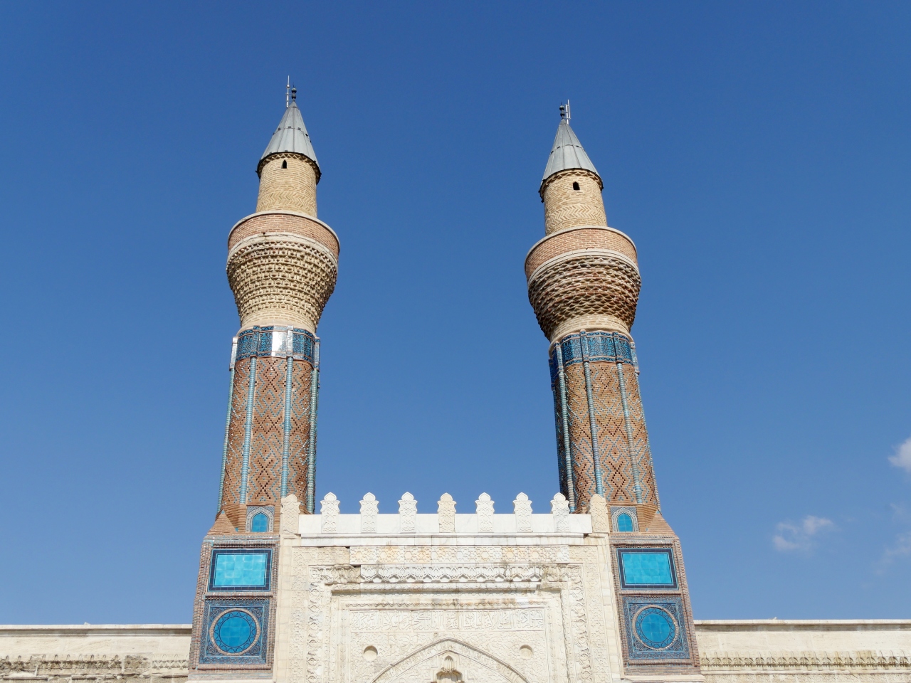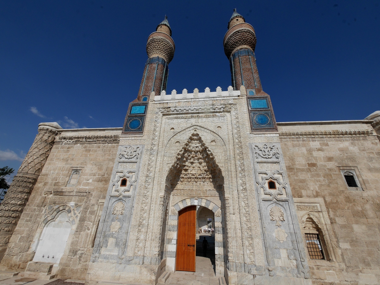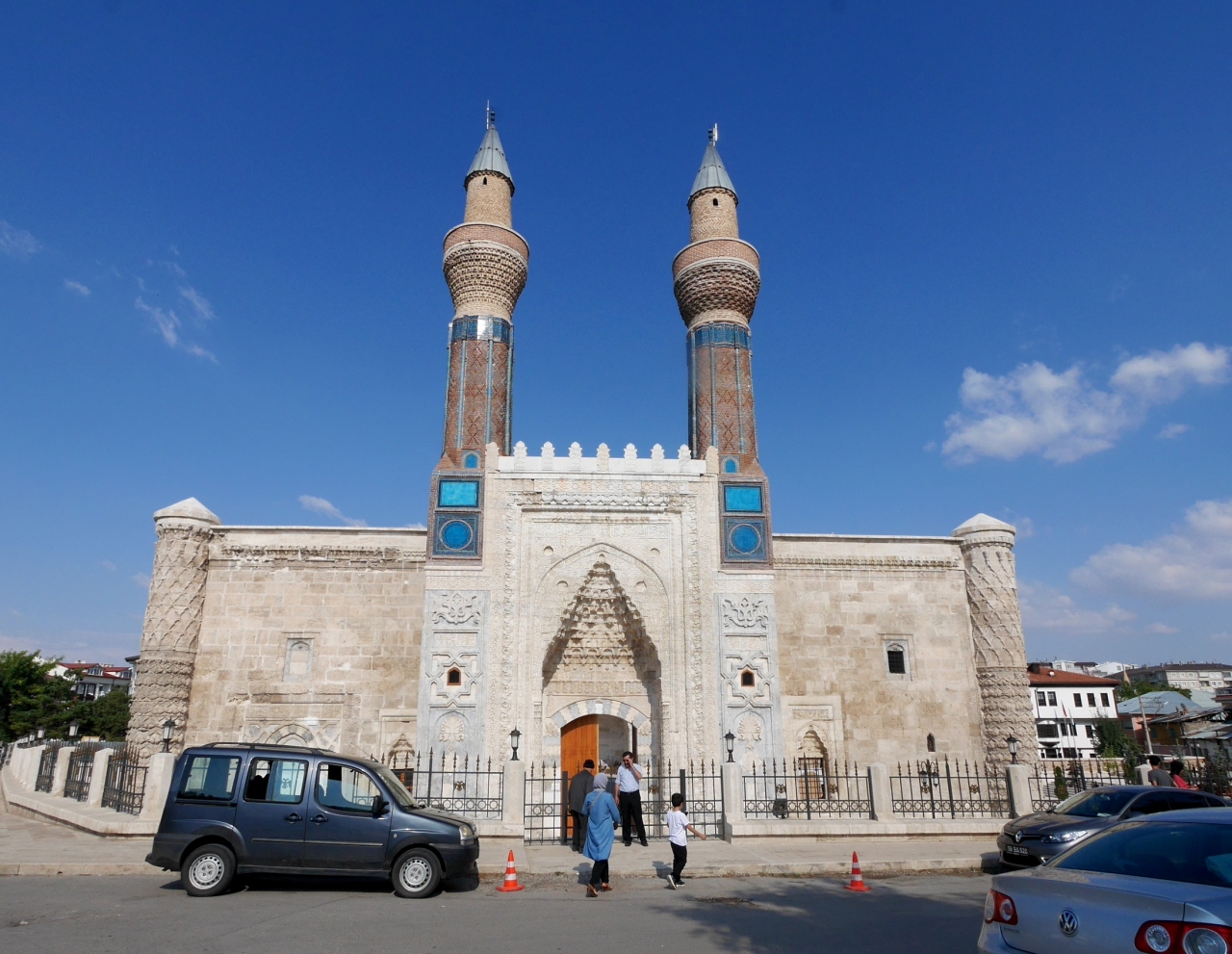 私がSivasで一番見たかったところだ.ギョクとは蒼天の青色の意味 青緑色のタイルに装飾されているので,その名がつけられた.尖塔ミナーレは25m.セルジュク朝の宰相サーヒッブアタ1271年にたてられた.中は修復中で入れないがその美しさは外から出も十分わかる