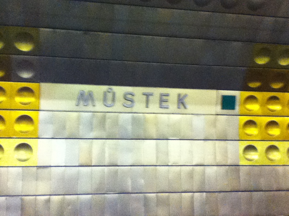 ムーステク駅はヴァーツラフ広場の北西にある地下鉄の駅である。駅改札口付近はやや暗いが売店等がある。ホーム等駅構内の案内は分かりやすい。ホームの壁には駅名のプレートの横にゴールド色の装飾がありユニークである。駅周辺には大きなショッピングモール等ショップ、レストラン、カフェがあり多くの観光客で賑わっている。これらショップやレストランで買物や食事をするのにムーステク駅を利用するのもいいかもしれない。