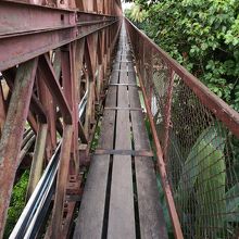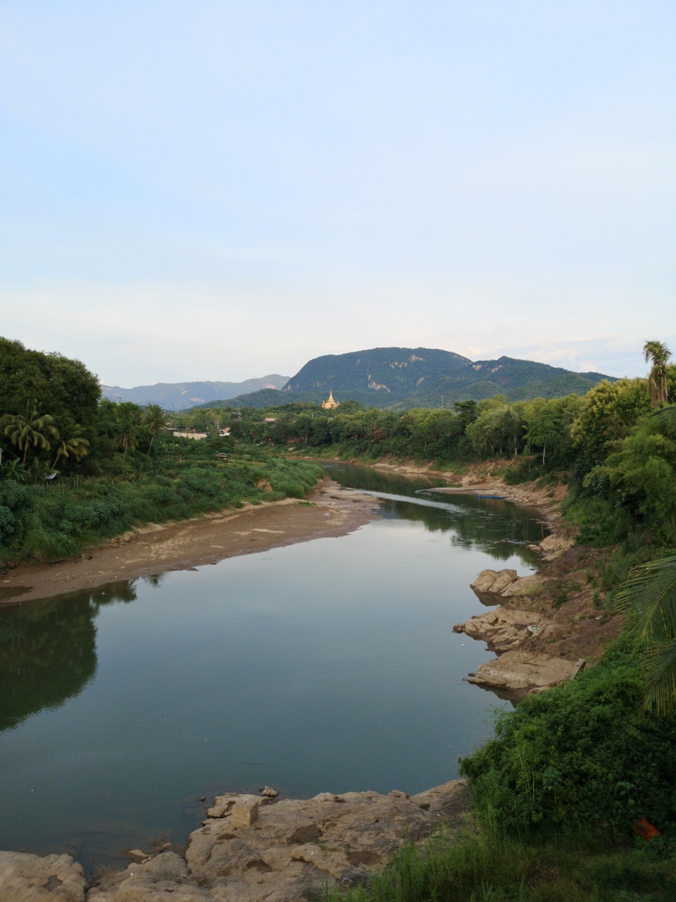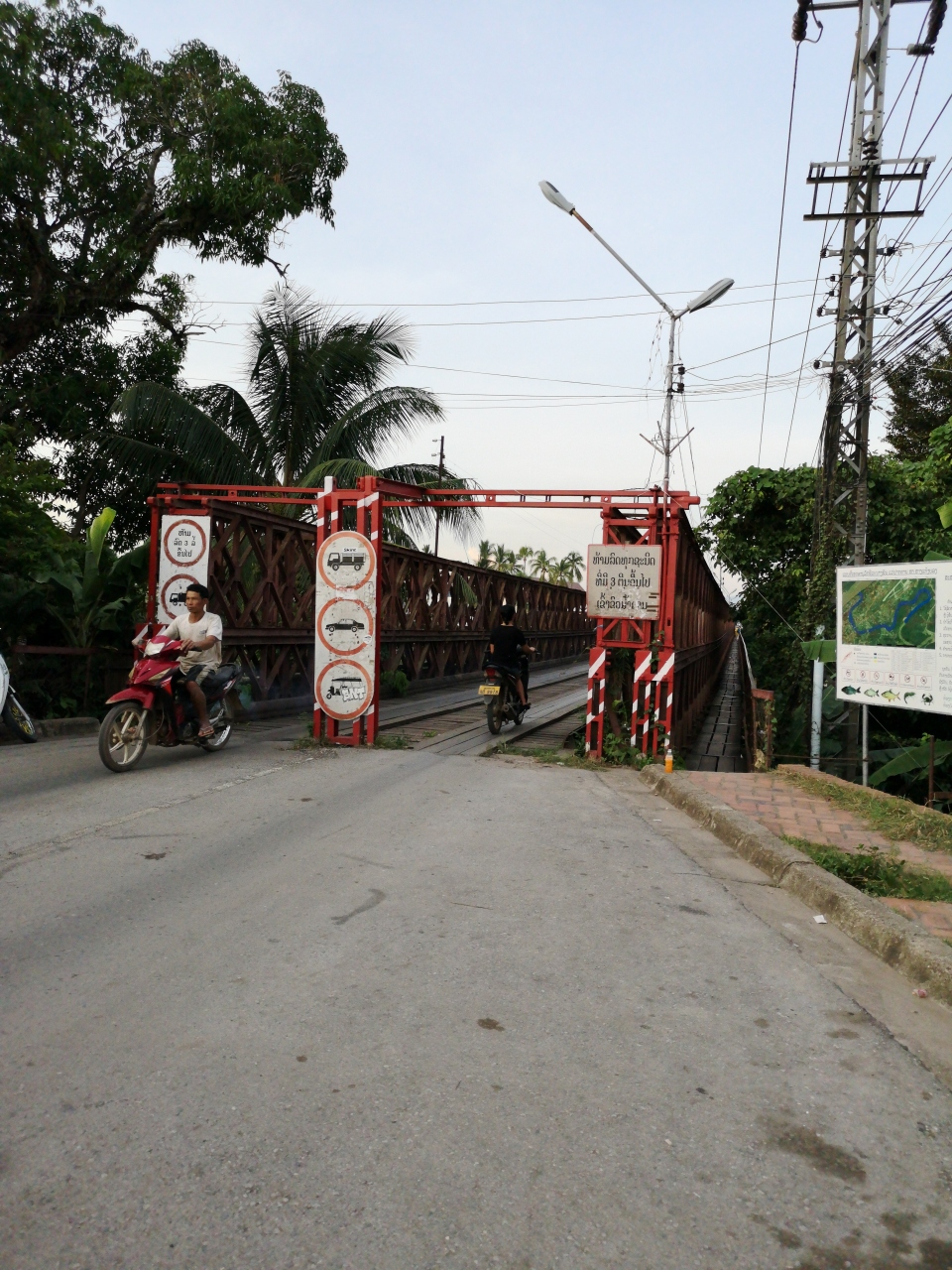 プーシーの丘に登ってみるとナムカーン川とメコン川の間に小さなルアンパバーンの町があります。ナムカーン川にはオールドブリッジというのがかかっており、この橋は鉄筋で骨組みはできていますが足元は木の板が渡してあるだけの橋です。車は通行できませんが、バイクや人は通行できます。歩いて渡るのがおすすめですよ!橋の途中上から下を眺めると気の遠くなるぐらいの高さ。だけど足元にあるのは木の板だけ。こんな恐怖はありません。バンジーなど恐怖体験が好きな方にはもってこいです。