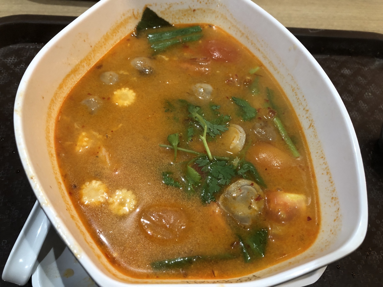 トムヤンクンを食べてきました。以前、他のフードコートでトムヤンクンを食べて美味しかったのでフードコートでも安いだけでなく美味しいと期待してたら辛いだけでした。一般的なフードコートで料理の種類もまあまあ、で小ぎれいでした。