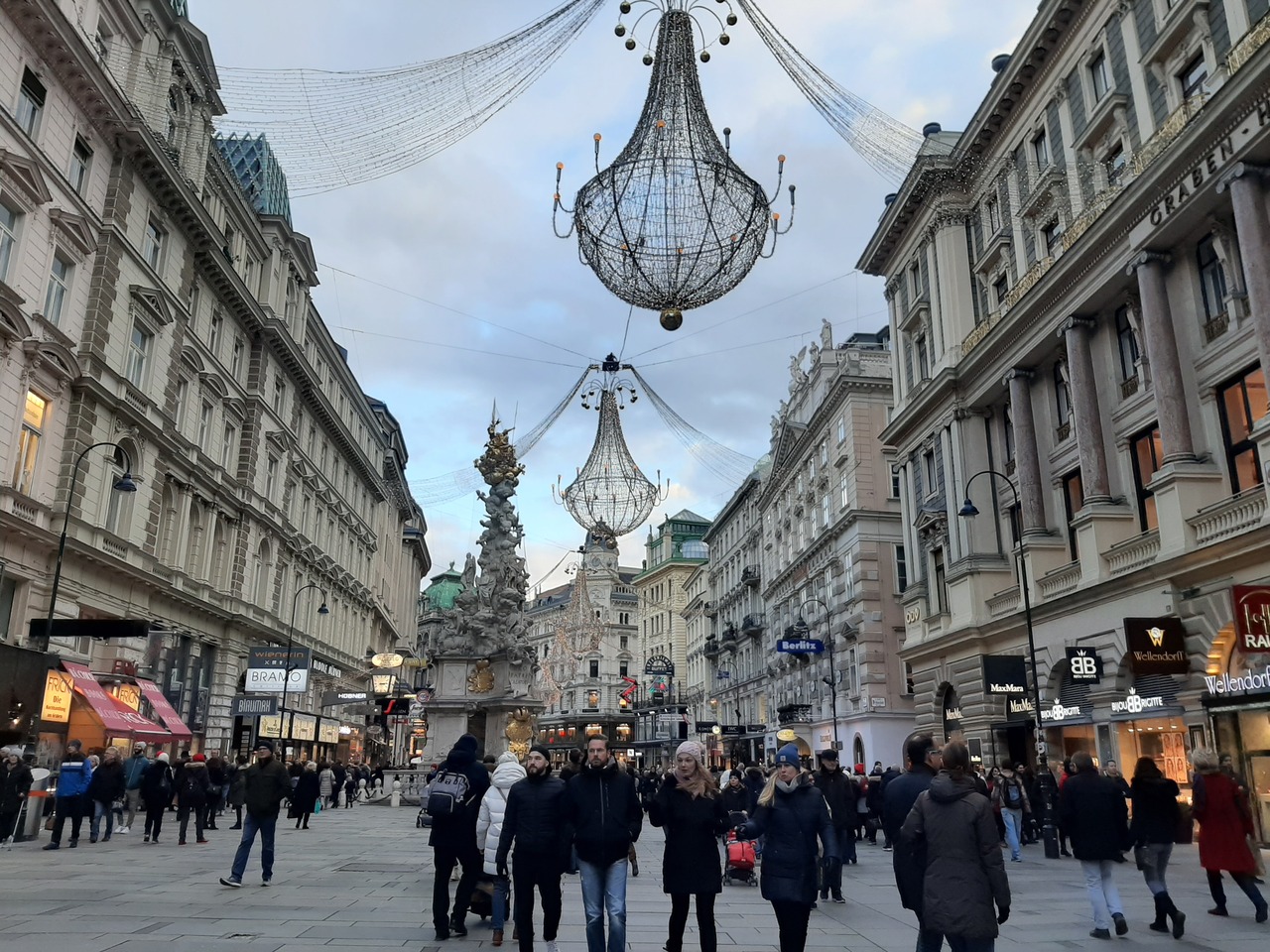 沢山の高級ブランドショップ、カフェ、お土産屋さん、飲食店が並んでます。皇帝レオポルド1世がペスト流行の終焉に作らせた、細かい彫刻が美しいペスト記念塔もあります。週末の午後、沢山の人で賑わってました。通りはクリスマスの装飾でキレイでした。