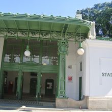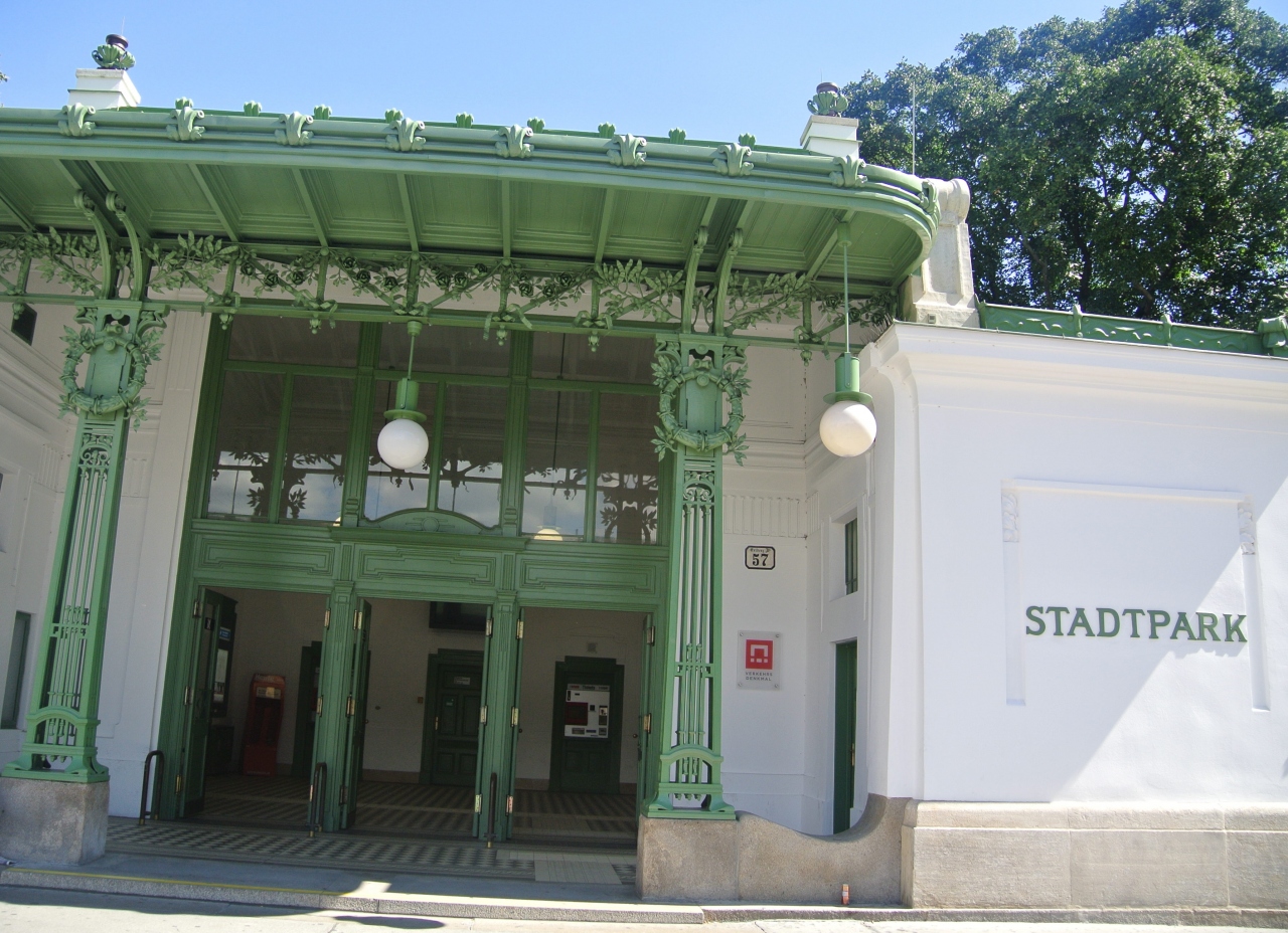 地下鉄4番線(緑色にライン)の駅です。文字通り、市民公園駅で、駅の入り口が市民公園の入り口(ヨハンシュトラウス像に近いところ)の横にあります。緑色のアールヌーボー調の美しいアイアンワークがすてきです。