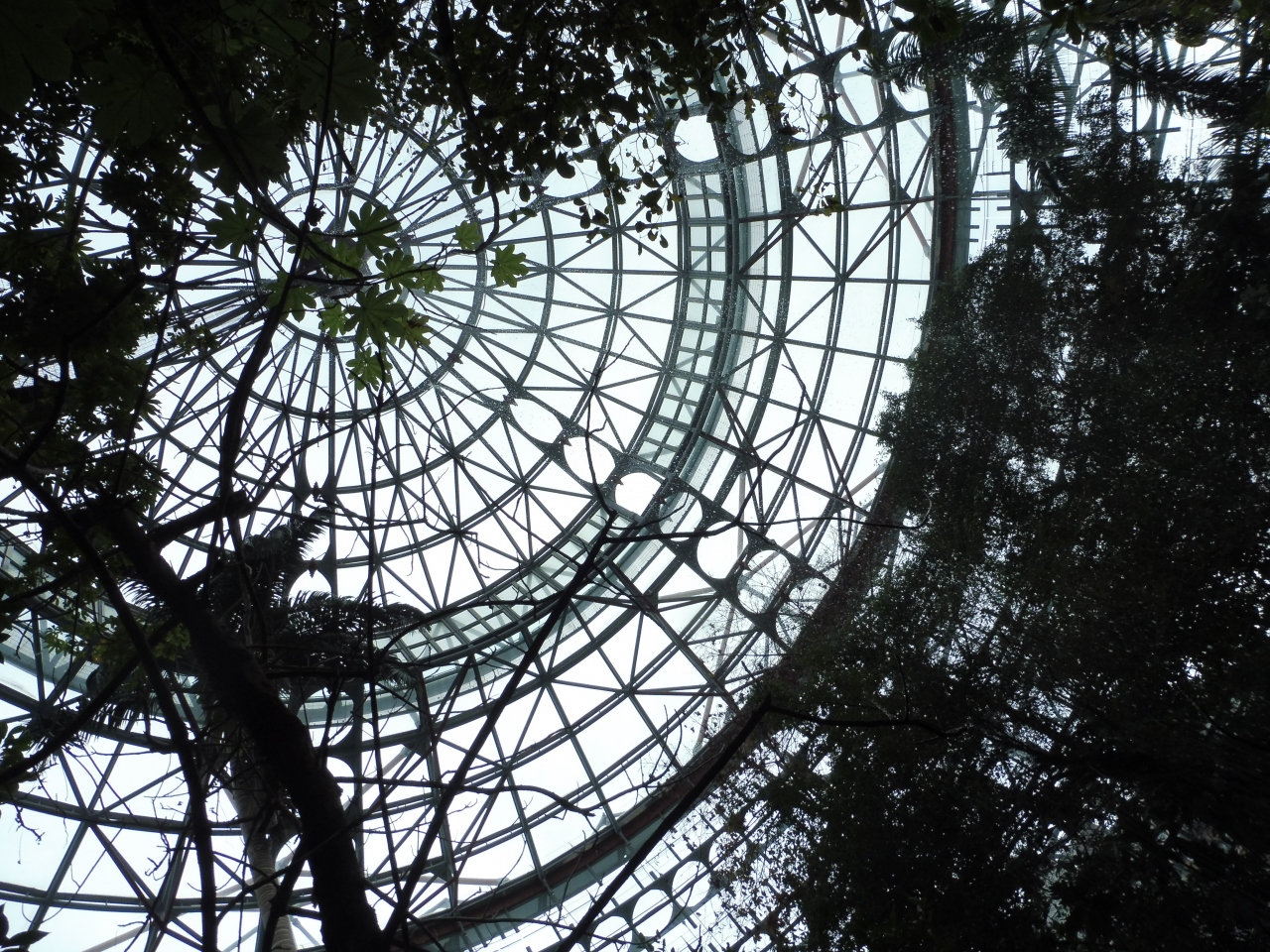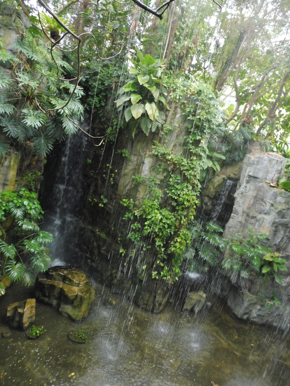 温室の巨大なガラス張りのドームの中には多種多様な熱帯植物が生えていて天井から滝が流れていました。定期的にスコールのように水が流れます。ここは大変涼しくて気持ちが良かったです。