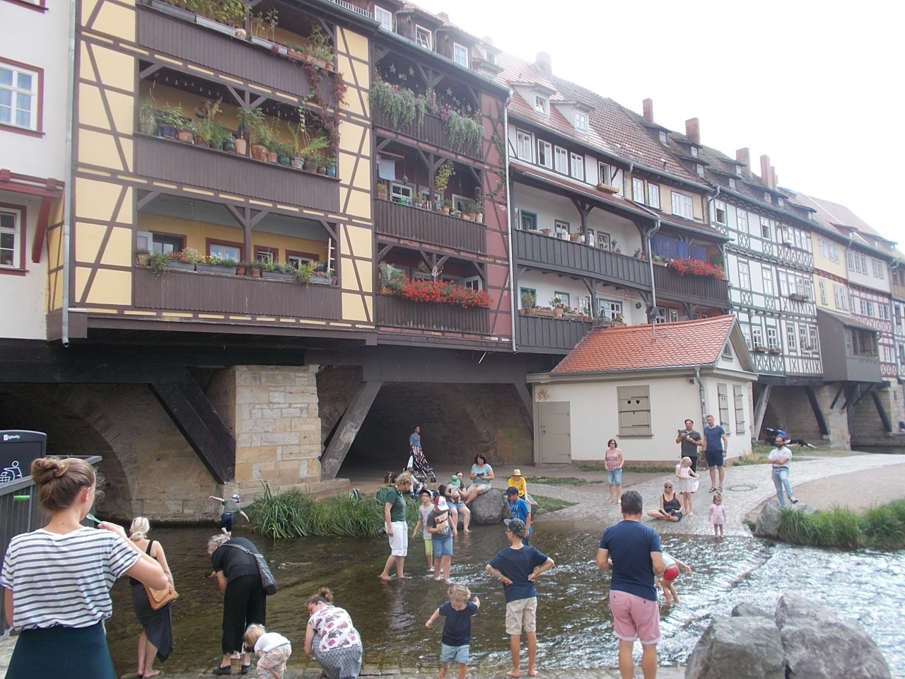 このクレーマー橋は旧市街地の中心的なエリアで東寄りにあります。町の少し東寄りを南北に流れるゲラ川にかかる橋です。橋というよりもショッピングの店が並んでいる通りを歩いているようです。小道の階段を降りると川岸に降りられます。そこで家が並んでいる姿を見れます。気を付けていないと橋だとはわからないです。