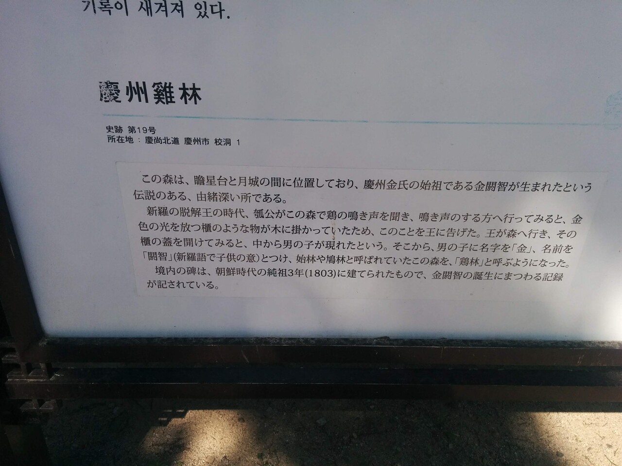 みなさんこんにちは、ふとももぷるぷるです。令和元年5月23日に韓国慶州市にある鶏林に行って来ました。鶏林は、東洋最古の天文台である瞻星台の近くにあり歩いて移動できます。新羅の王姓でもある慶州金氏のルーツも実はこの小さな森にあり西暦65(脱解王9)年のことです。瓠公(ホゴン)という人が半月城(パヌォルソン)のそばを歩いていると、始林というところがキラキラと光っているのを見つけました。その場所には天から紫色の雲が伸びており、見ると木に金色の櫃がかかっているではありませんか。その木の下では鶏が何かを知らせるかのように声高く鳴いています。これはただ事ではないと驚いた瓠公は、時の王である脱解(タルヘ)王に報告をしました。すぐさま王が始林まで駆けつけ金の櫃を開けてみると、なんと中から美しい男の子が出てきました。大いに喜んだ脱解王はこの男の子を閼智(アルチ)と名付け、また金の櫃から生まれたとして「金」の苗字を与えました。このとき与えられた金の苗字が現在まで脈々と続く慶州金氏の始まりです。その後、始林と呼ばれていたこの場所は木の下で鶏が鳴いていたことから鶏林と呼ばれるようになったそうです。