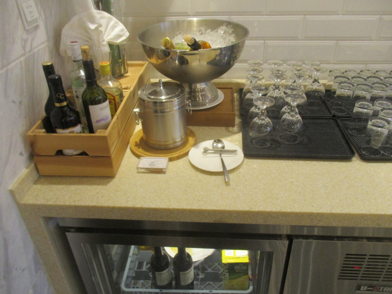 上海虹橋空港 日本航空 国際線ビジネスラウンジはアルコールが充実していました。スタッフがきれいに並べたボトルが置いてあり、冷蔵庫には青島ビールも置いてありました。全種類制覇というわけにはいきませんでしたが、搭乗まで数種類のアルコールを飲みくつろぐことができました。