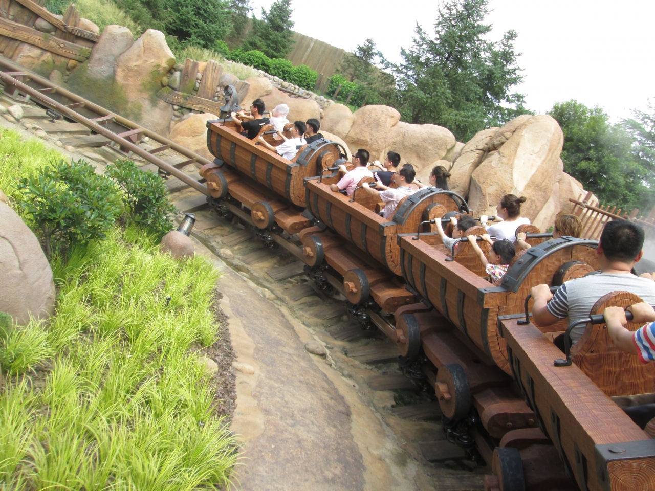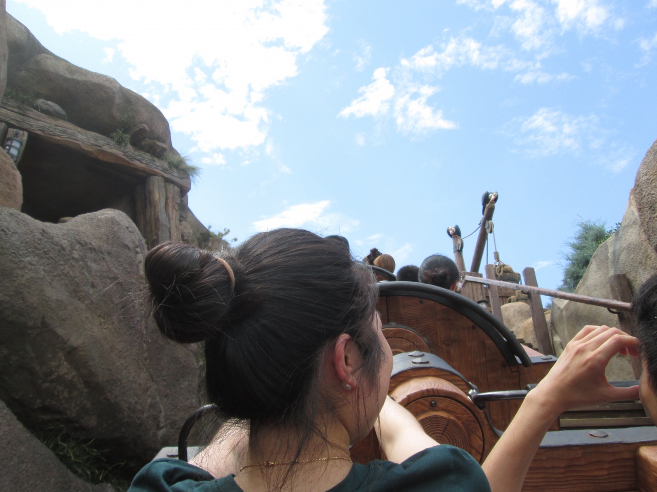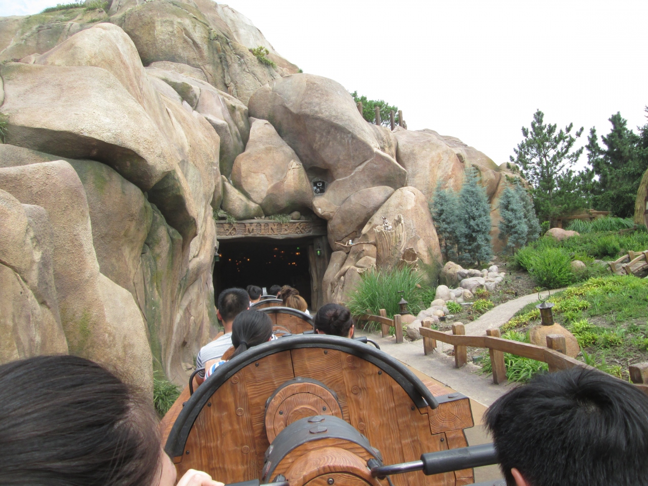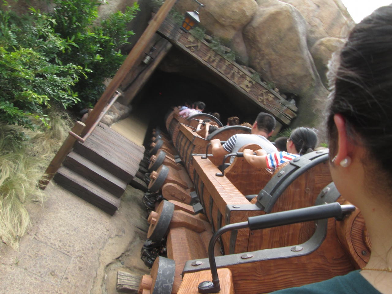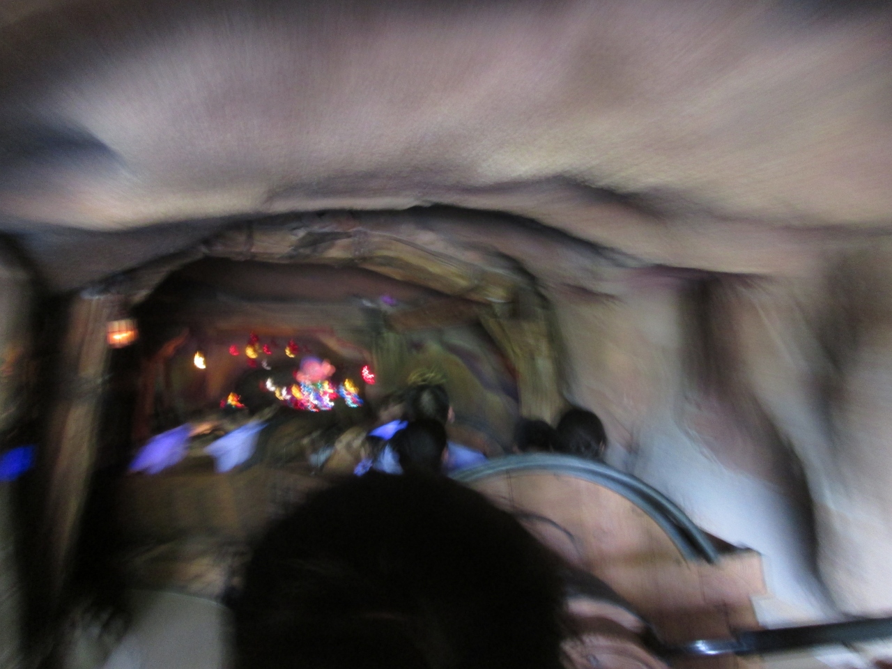 七人の小人のマイントレインはスピードの出るアトラクションですが、かばんなどの手荷物を足元に置くだけで、スタッフはシートベルトの確認だけで、乗車前にカメラ、眼鏡などのチェックはありませんでした。このアトラクションはディズニー恒例の瞬間写真サービスがないので、乗っている間の写真を撮影したいときは自分で自由に撮影できました。