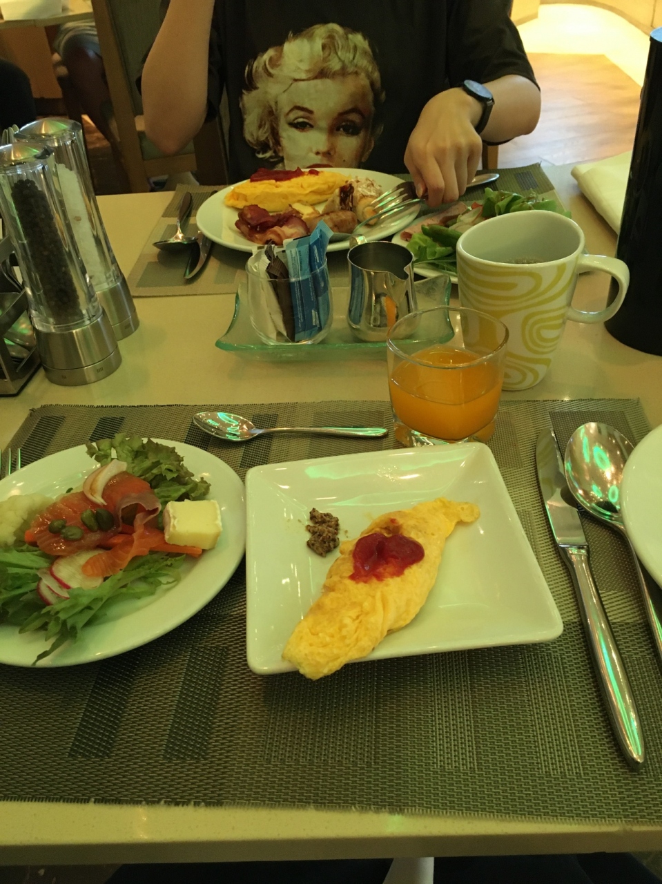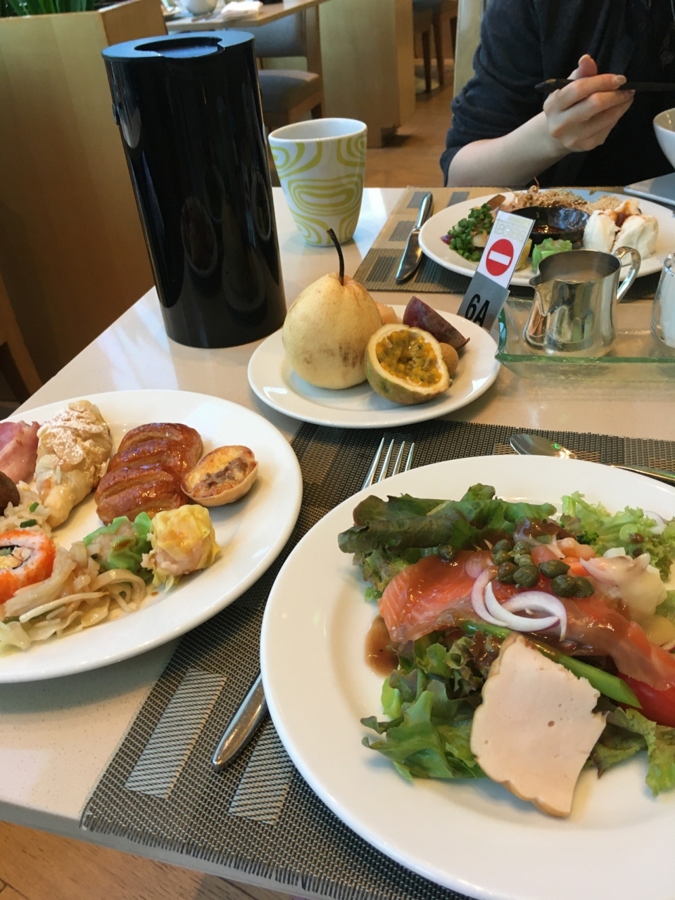 フルーツやサラダ、生のしぼりたてジュースやヨーグルト、コーンフレーク等々、パンの種類も多くて、自分で焼いたりもできます。さらにタイの米粉パンやワッフル、ペストリーやケーキ。日本食もタイ料理にベトナムフォー、中華に欧風の定番も。卵料理は目の前で作ってくれます。2泊じゃ回りきれないです。特にパンが美味しいとテンション上がります。