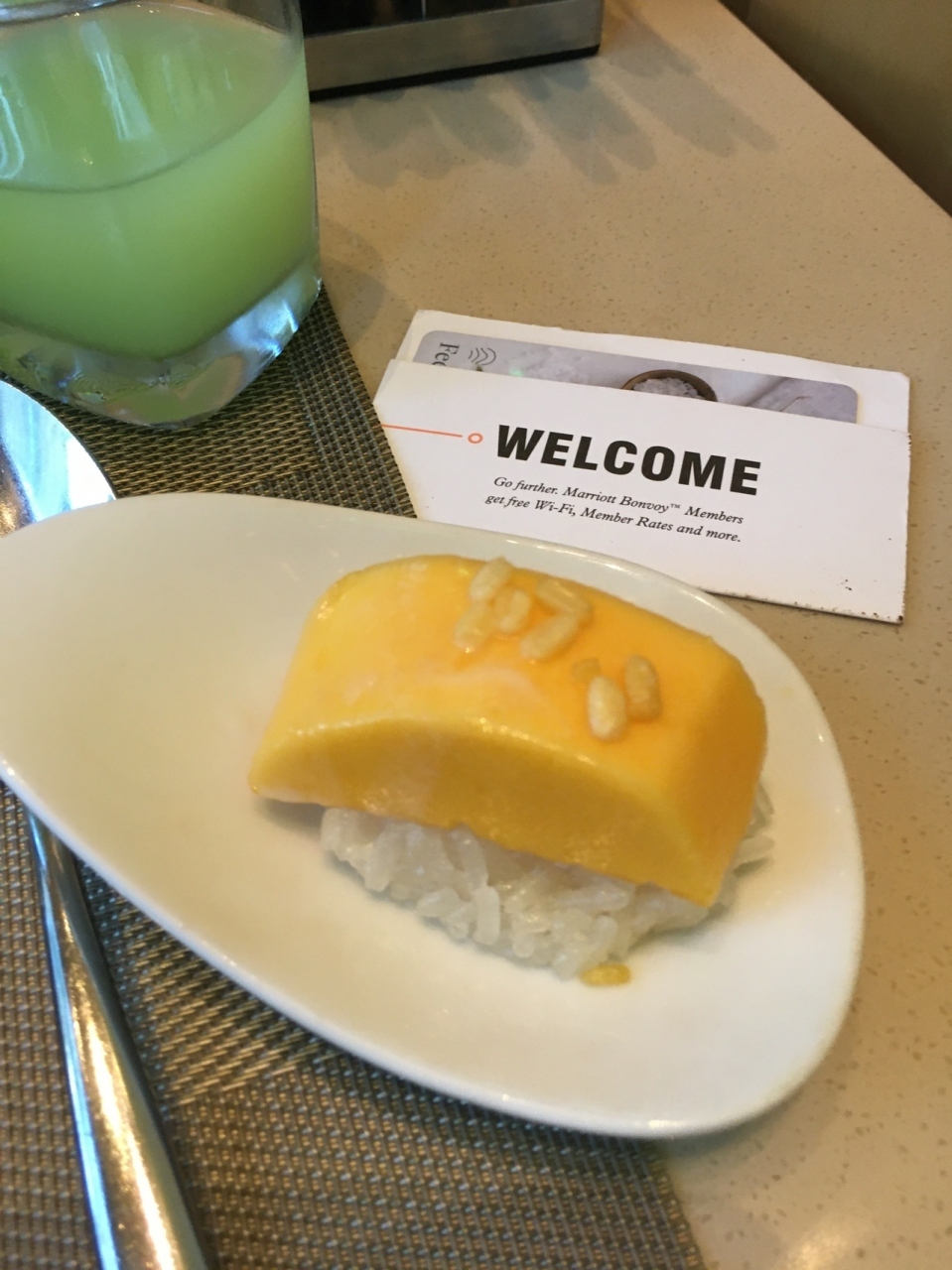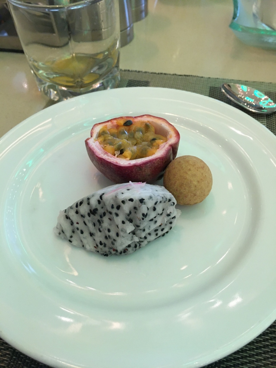 さすが南国のホテルです。大好きな小さな実(龍眼)もありました。大好きなマンゴは【カオニャオ・マムアン】でのみ。ココナッツミルクで炊いた餅米に、マンゴーを載せたタイの定番お菓子です。(残念ながら好みではないんです)