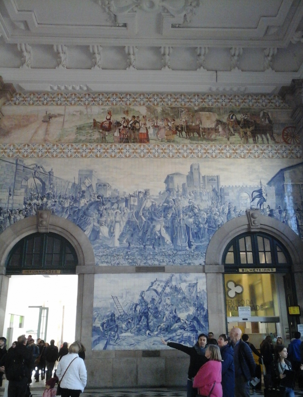 リスボンからポルトに到着して、乗り換えてこのサン ベント駅に到着しました。四方の壁には青白タイルのような2万枚のアズレージョで埋め尽くされています。ポルトガルの交通史および王室の生活風景が描かれています
