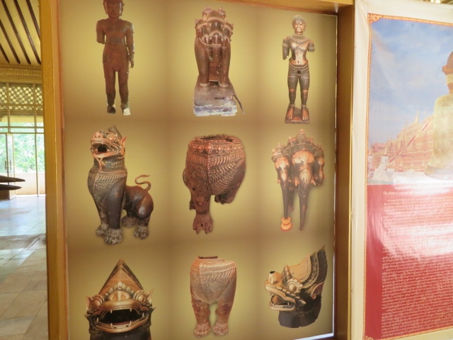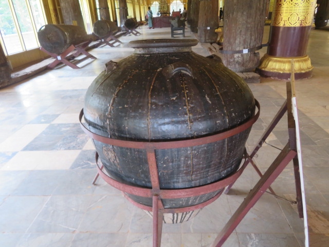 古都バゴー市街の王宮発掘現場で再建されたモン族の城塞・王宮と出土した建材、王座や調度品、壺などが展示されている博物館を見学しました、王宮は火災で消滅しましたが再建されて黄金の部分が多い豪華な博物館に、写真の展示が多くありました、ここは寺院ではないので靴のまま歩くことが出来ました。