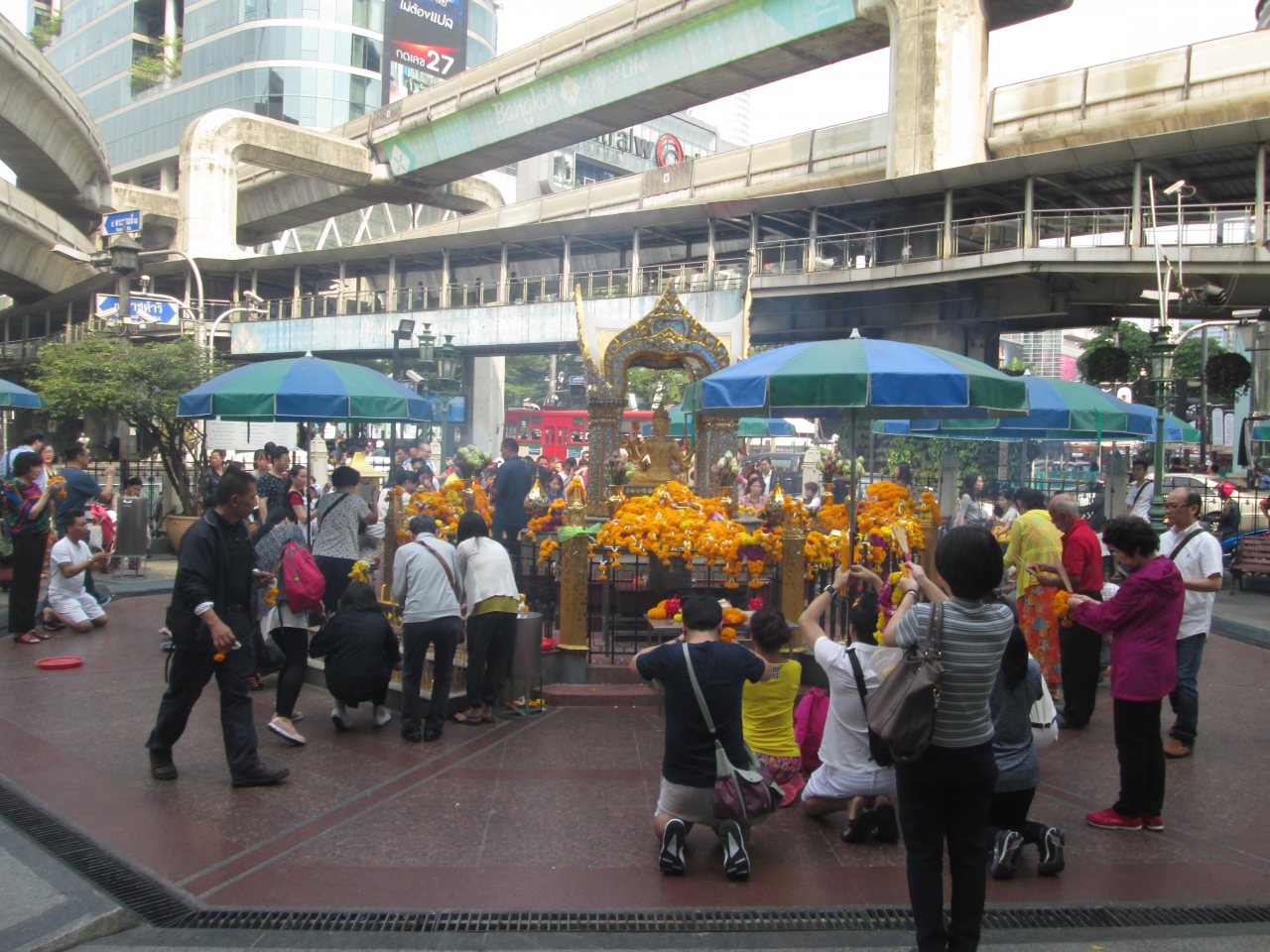 ラチャダムリ通りとラーマ1世通りのラーチャプラソン交差点にエーラーワンの祠があります。ヒンドゥー教のブラフマー神を祀った祠で願いが叶うということで、暑い日でも雨の日でも天候に関係なく熱心にお参りしている人がいます。また、境内ではタイ伝統舞踊が披露されるので見どころです。