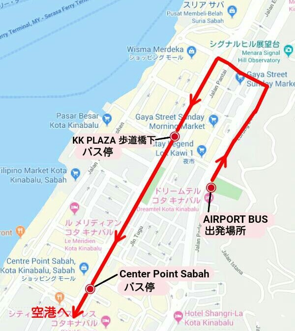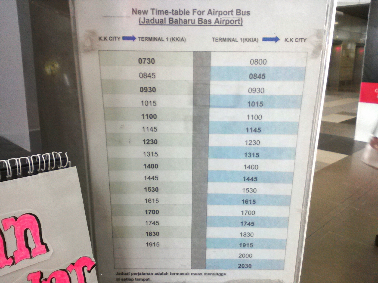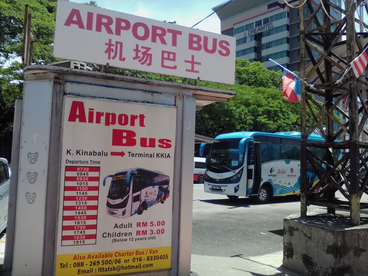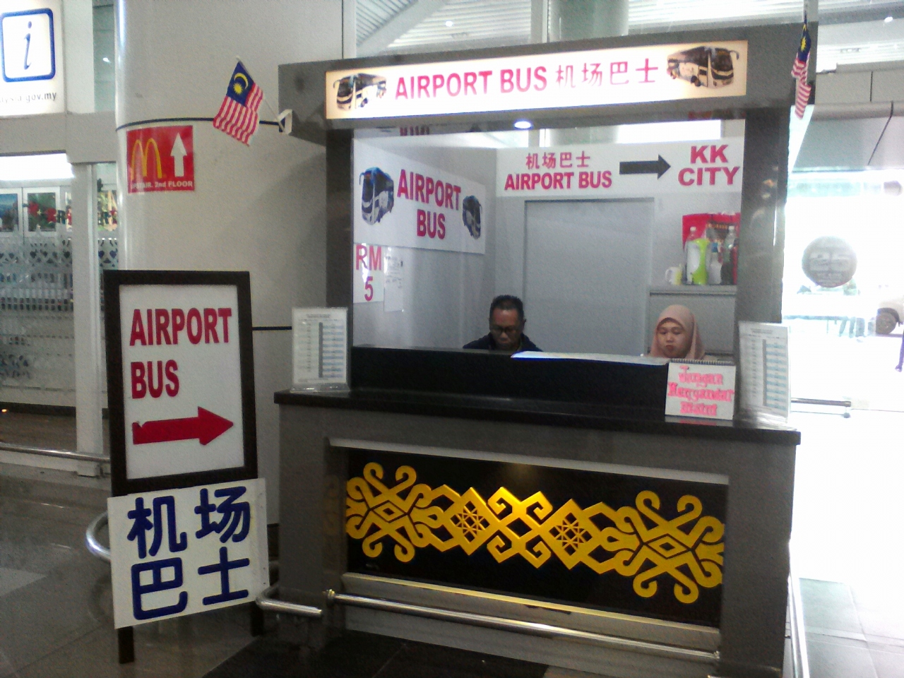 市内から空港へのバスを利用しました。出発場所はムルデカ公園前。「AIRPORT BUS」と書かれたチケット販売小屋があります。出発時刻は7:30〜19:15の間に45分間隔で16便、料金は5RM(子供3RM)。途中、Jalan Tun Razakの「KK PLAZA」に通じる歩道橋下と「Center Point Sabah」前にバス停がありそこからでも乗車できます。ルートは写真の地図を参照して下さい。木曜の12:30のバスに乗りましたが所要25分でした。朝夕の市内は渋滞が激しいので時間に余裕をみることをおすすめします。