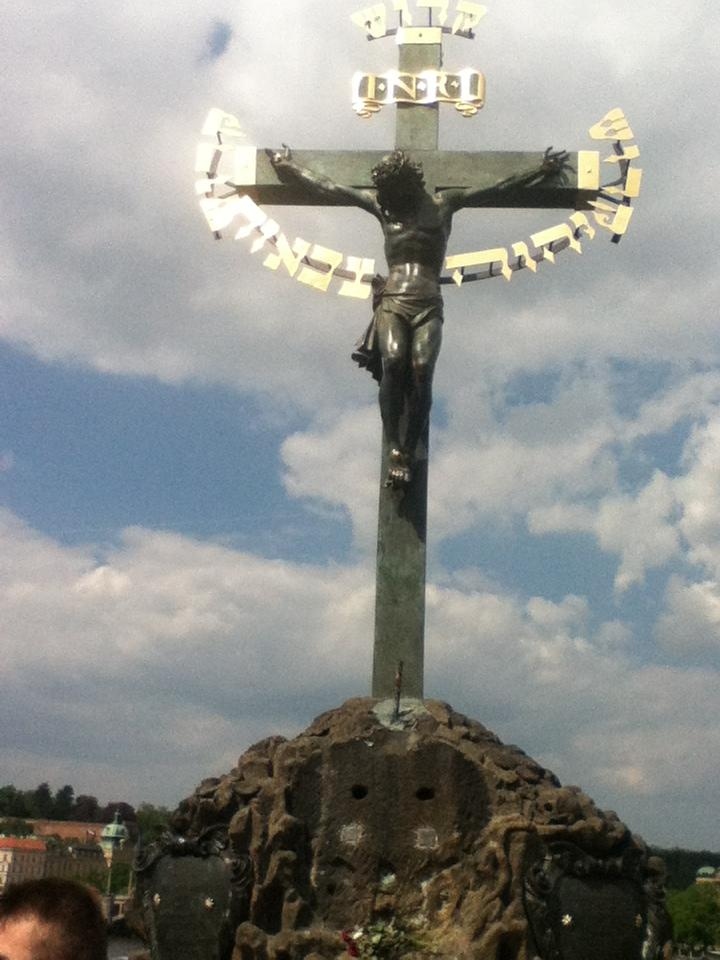 受難の像はカレル橋の欄干に並んでいる聖人の像の一つ、十字架にかけられたキリストの像である。十字架につけられた金色のものが輝いていた。キリストの姿を丁寧に描いており立派な像である。観光客がかなりいるが、じっくりキリストの像を見るのもいいかもしれない。
