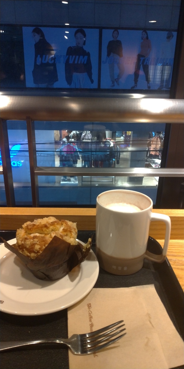 韓国ではメジャーなカフェチェーン店で結構どこにでもあります。こちらの弘大店は繁華街の中心にあり、深夜まで営業して便利に使えます。雰囲気はスタバに似ていますが安いです。マフィンがおススメで3階にもイートインスペースがあり眺めがいい。