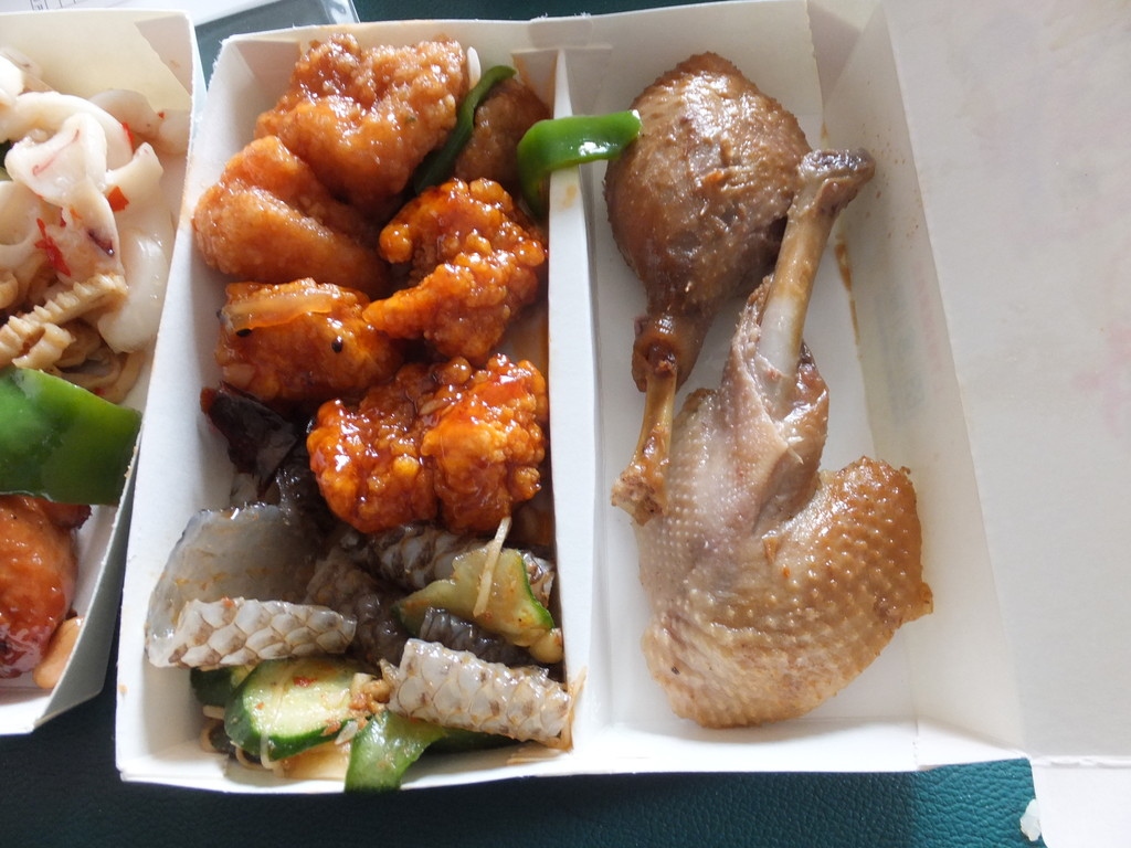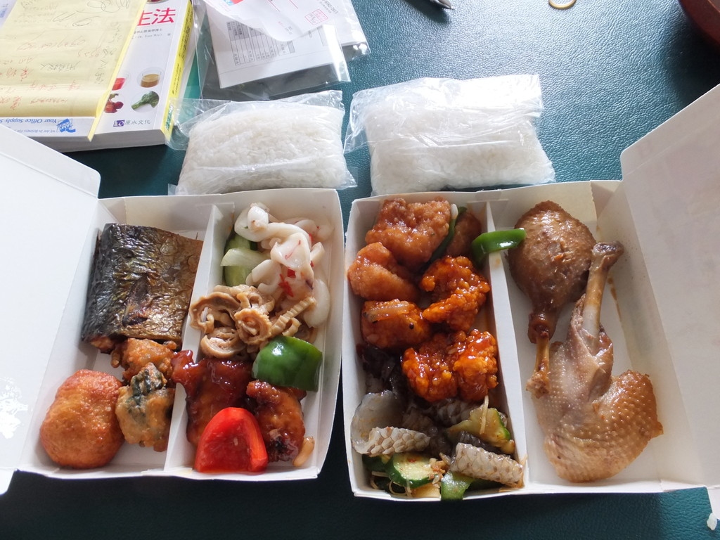 鶏、酢豚、イカ、内臓、魚の皮、肉団子、鯖の塩焼き、御飯2つで180元。