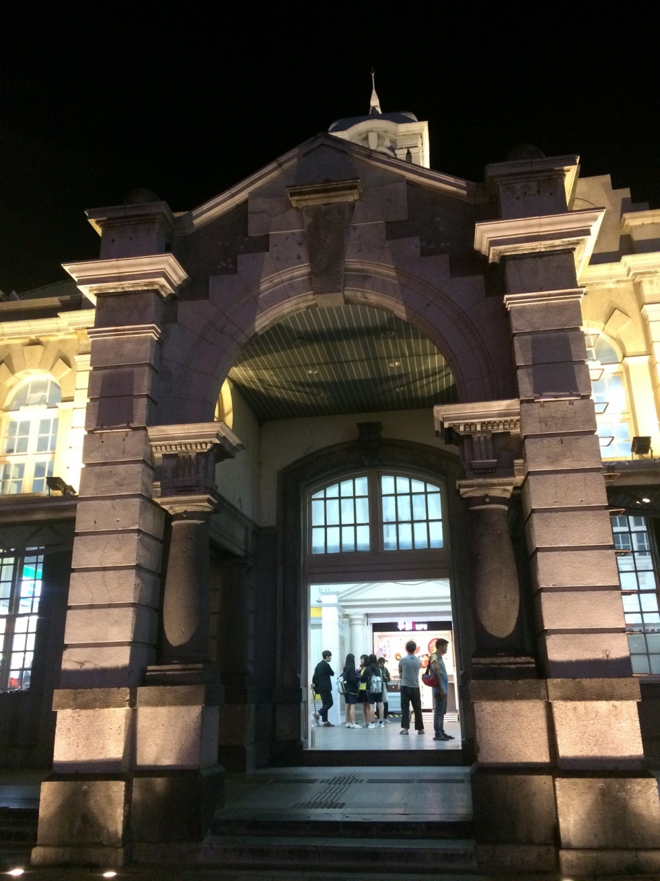 新竹駅は台北駅から各駅停車の列車に乗って、1時間強でした。駅前からはタクシーやバスが出ています。昼の美しさも良かったですが、夜にライトアップされた状態の駅はレトロ感が高まって写真に映えました。コンビニも駅内にあります。