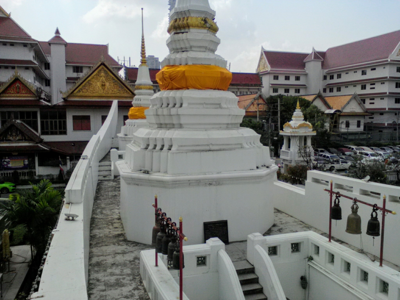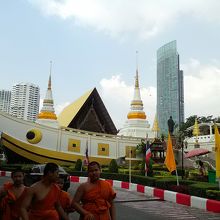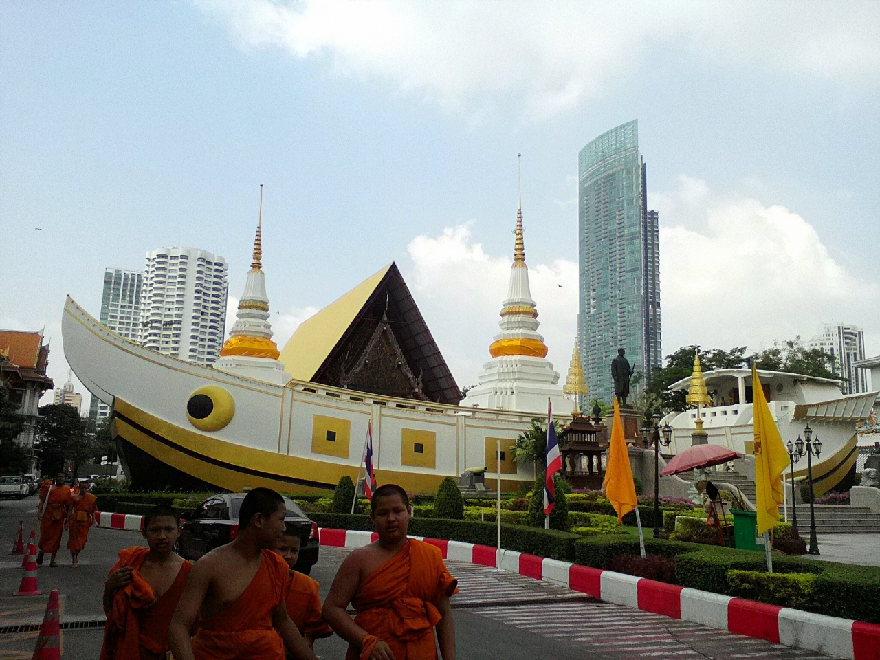 BTS「サパーンタクシン」駅から徒歩5分ほどです。この寺院が他と違うのは船型の仏塔があるということ。なかなか珍しいと思います。甲板部分にある仏塔へは“船尾”から行けます。また、甲板から見るお堂越しの高層ビル群は圧巻の一言。バンコクらしい迫力ある眺めが堪能できます。