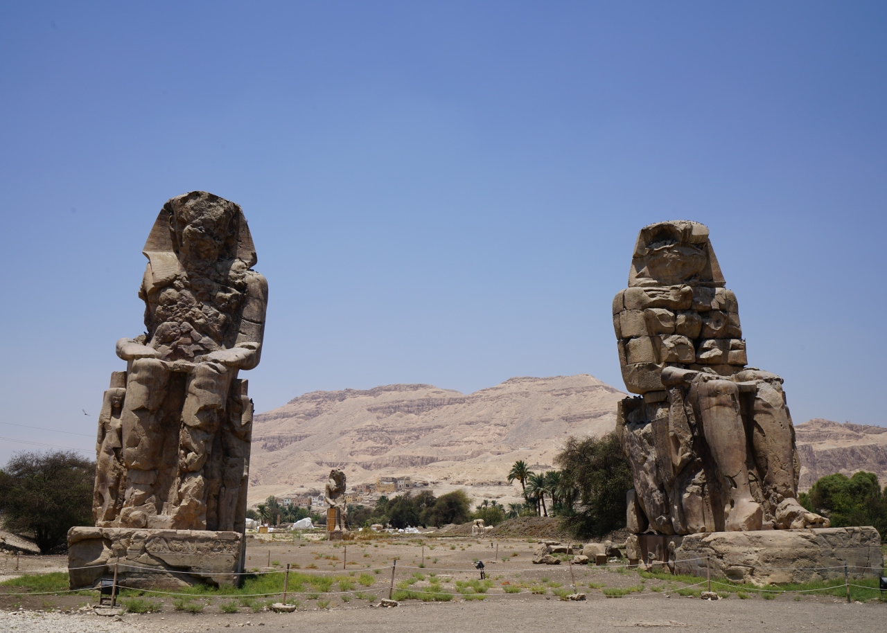 王家の谷の帰りに行きにメムノンの巨像に寄りました。ここはチケットは不要です。一枚岩できた巨像は高さは約18m、近づくとその巨大さがわかります。