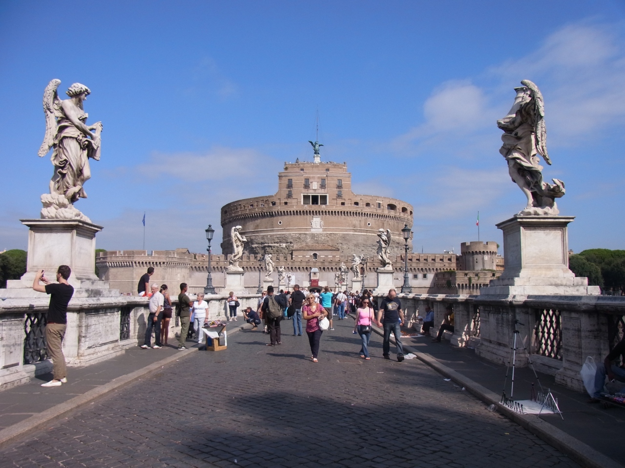 ローマの市街地を流れるテベレ川にかかっている橋です。橋の先にはサンタンジェロ城がたっていました。橋の両側には彫刻があって美しい橋でした。橋の先にはバチカンなど観光スポットが多いため、観光客が大勢行きかっていました。