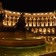 ローマのテルミニ駅から近い場所にある広場です。宿泊していたホテルが近かったので、夜に散歩がてら出かけました。広場の中央には美しい噴水があって、その噴水と周辺の建物がライトアップされていて、美しい夜景を楽しむことができました。