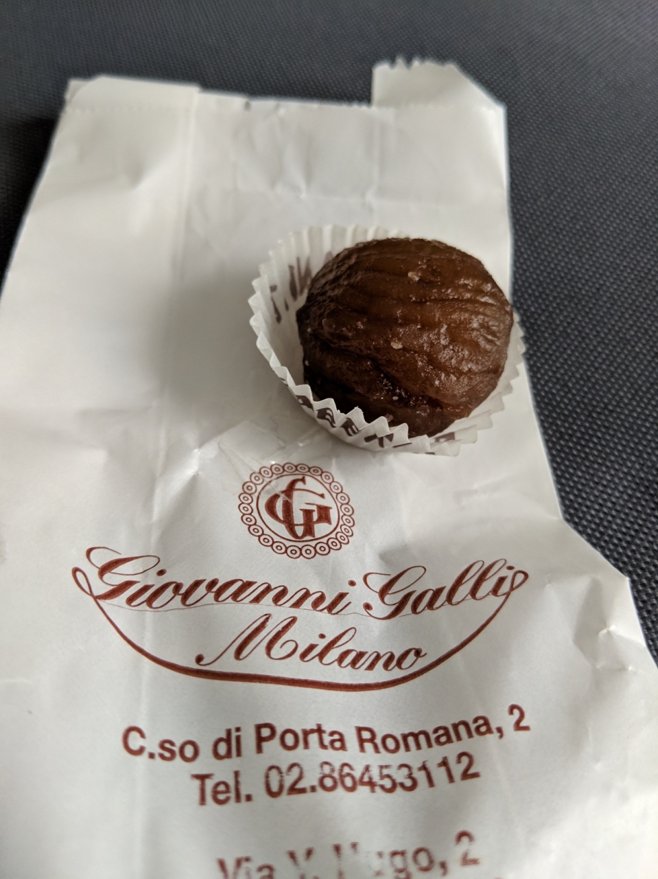 本当はお土産にしようと行ったマロングラッセの店。ミラノでは有名ということで行きました。が、紙袋に包んでくれただけだったのと、日持ちしないのとで、結局自分で食べました。大きめの栗で、日本のそれとは違いますね。甘すぎず、まぁまぁかな。