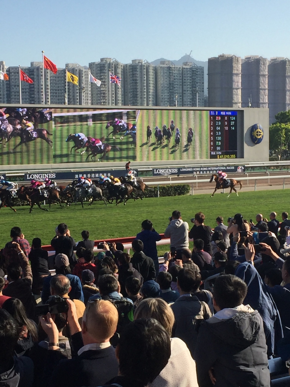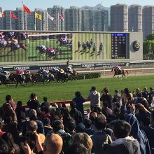 年末の香港国際競走が開催されます。ホンハム駅から馬場駅で降りると駅と直結しています。オクトパスカードでも入場できるし、外国人はパスポートを提示して、現金で190ドル払えば会員席に入ることができます。会員席は現金で馬券を購入することもできるし、国際競走の日は日本人が来ることを考えて日本語ができるスタッフもいます。