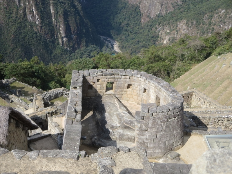 ガイドさんに説明を受けながらマチュピチュ遺跡を巡りました。日時計は印象的で、張り出すような場所にありました。冬至の時は光がまっすぐに伸びてくるとのことで、さぞ神秘的であろうと思いました。混んでいる時などルートが制限されて見られないこともあるようでした。