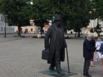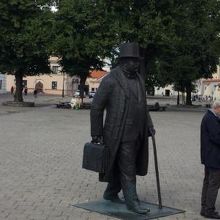 このカバンを持って杖をついている像が外国人観光客には人気でした。