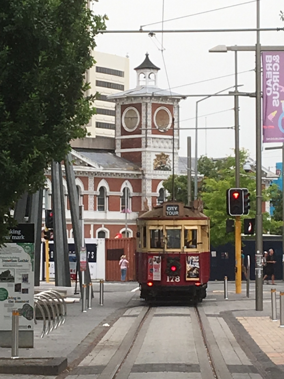 レストランや商店側が並ぶ歩行者用の歩道の真ん中をゆっくりと走るレトロなトラムは、クライストチャーチの市街の街並みとマッチしていて、とても絵になります。旧大聖堂周辺を走っていますが、観光用でぐるっと回るので、歩いた方が早かったりします。