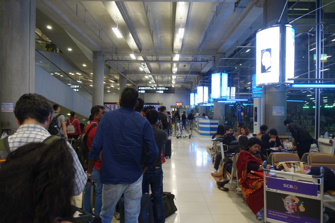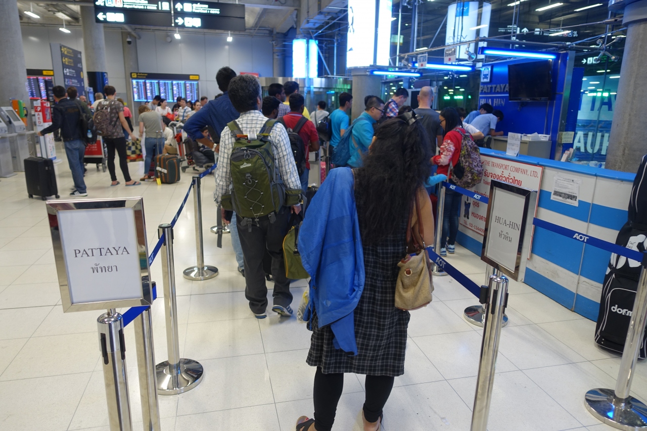スワンナプーム空港からパタヤまで乗りかえなしで結ぶバスです。空港からバンコク市内には寄らずに直接パタヤに行く人に便利。空港1階、8番出口の脇にバスのチケットカウンターがあります。左の列がパタヤ行き、右がフアヒン行きで、パタヤ行きのほうはすごい行列でした。