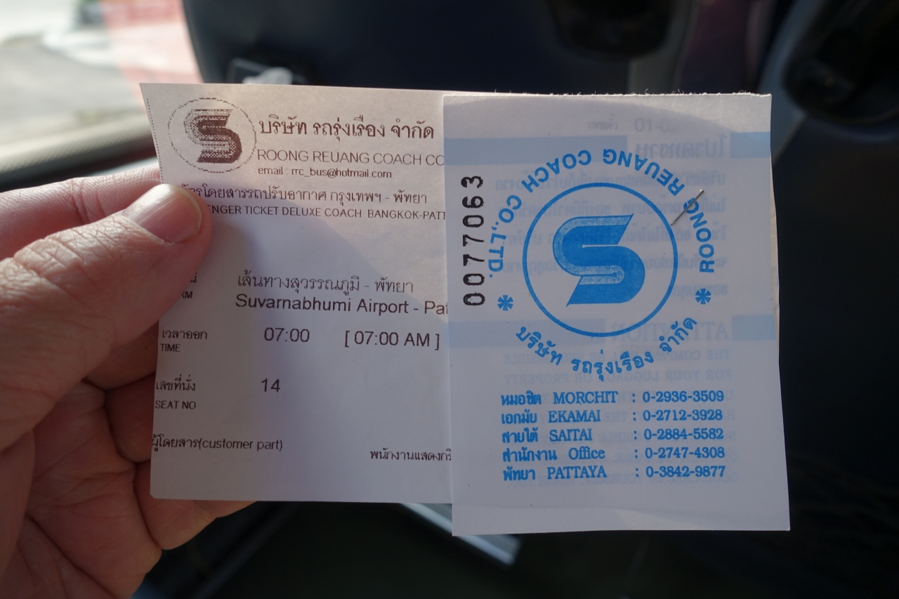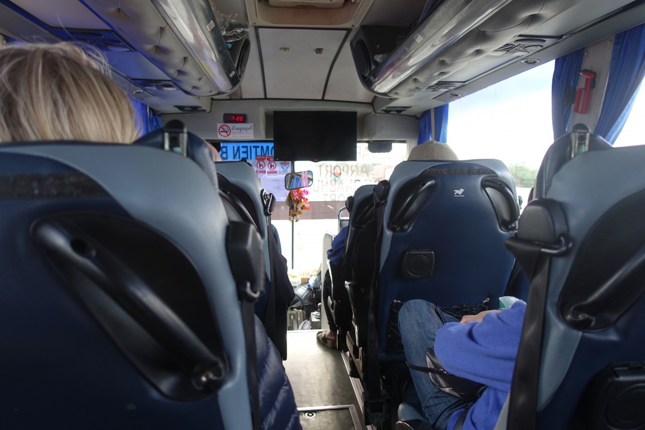 運賃は片道120バーツ。支払いは現金で。チケットには出発時間と座席番号が印字されているので確認してください。空港発が朝7:00から22:00まで1時間おきの運行。自分は7:00発のバスでしたが、この時はこれが初発ではなく、利用者が多いせいか6:30発、6:45発とこれよりも前に何本かバスが出ていました。満席の場合は何本かあとの便になる可能性もあると思います。
