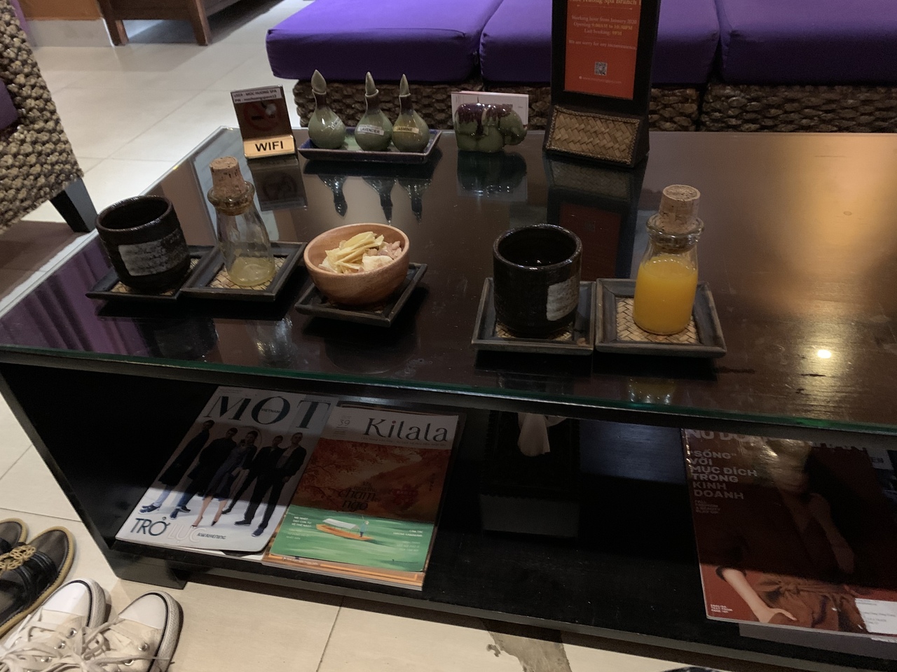 ぼぼフラットなソファで、足湯につかりながら頭・肩・背中を軽くマッーサジ→膝下マッーサジ→うつ伏せで肩・背中・腰・腕マッーサジ→椅子に座りタイ古式マッーサジのような施術の流れでしたが、暑いホーチミンで歩き回って疲れた全身が、すっきりとリセットされました!