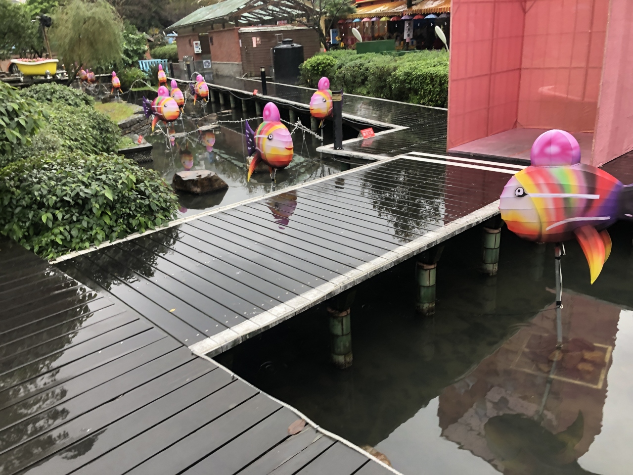礁渓の鉄道駅から歩いて5分、バスターミナルからでも10分とかからないところに小さな川沿いに広がる公園駅から公園に至る道には飲食店や土産物店がずらりと並び、観光客でひしめき合っている。私たちが訪れたのは12月中旬の平日であったが、台湾人観光客でいっぱい。公園は遊歩道になっており、両側にはフィッシュセラピーの足湯が並んでいる。奥には日本式の風呂を持つ湯囲風呂がある。