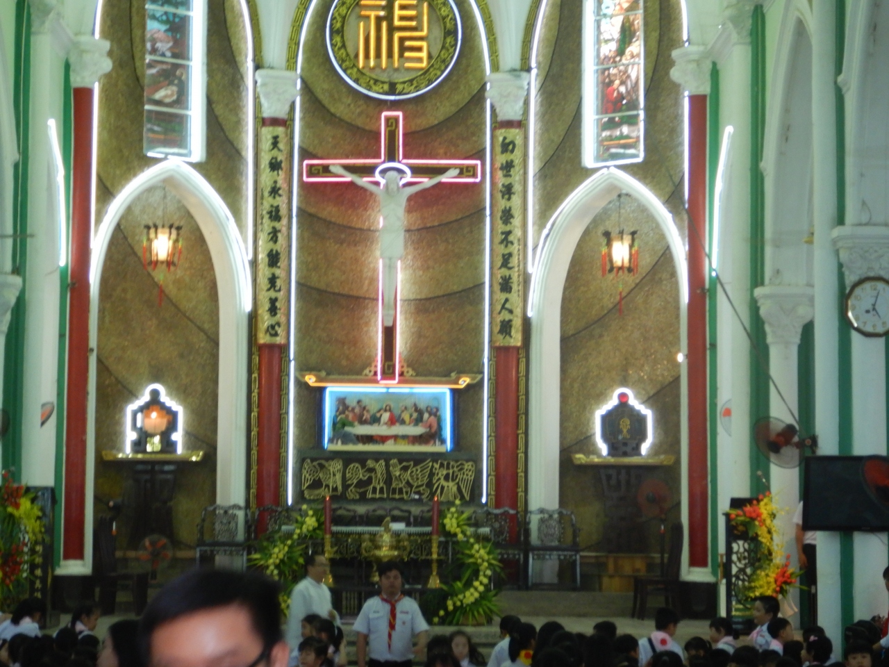 チョロンのカトリック教会。クリーム色の尖塔が目を引く。夕方だったが、かなりの人がお参り来ていた。聖堂の中に入ると漢字で書かれた文が正面にある。外のマリア像が納められている建物も中華風でサイゴン大教会とはまた違った趣があってよいと思う。