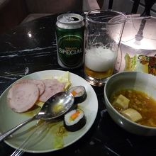 巻きずしやハムなどでビールを飲む。ビール好きにとっては缶ビールではなく、生ビールが欲しいところだが、ぜいたくは言えないかな。