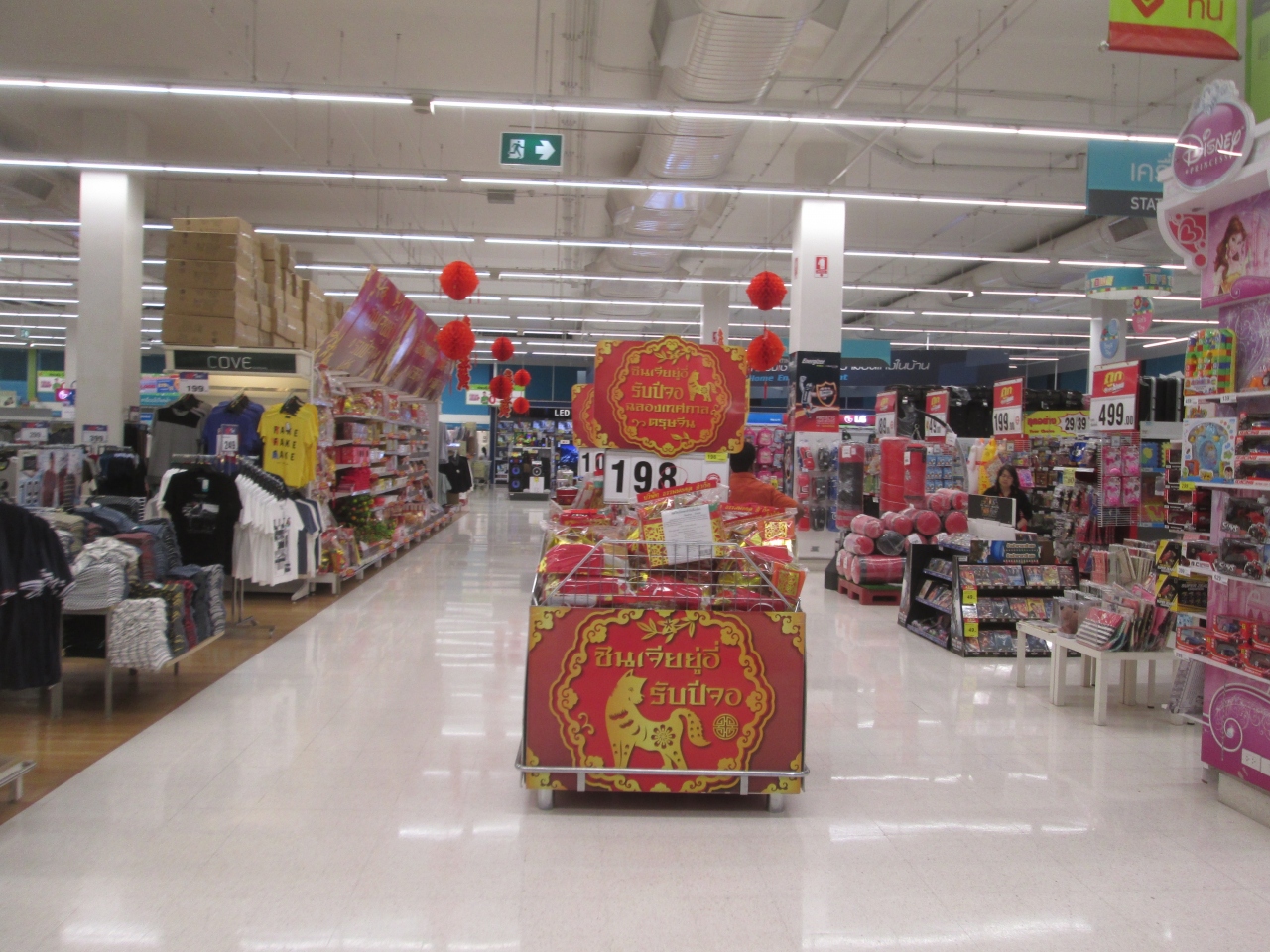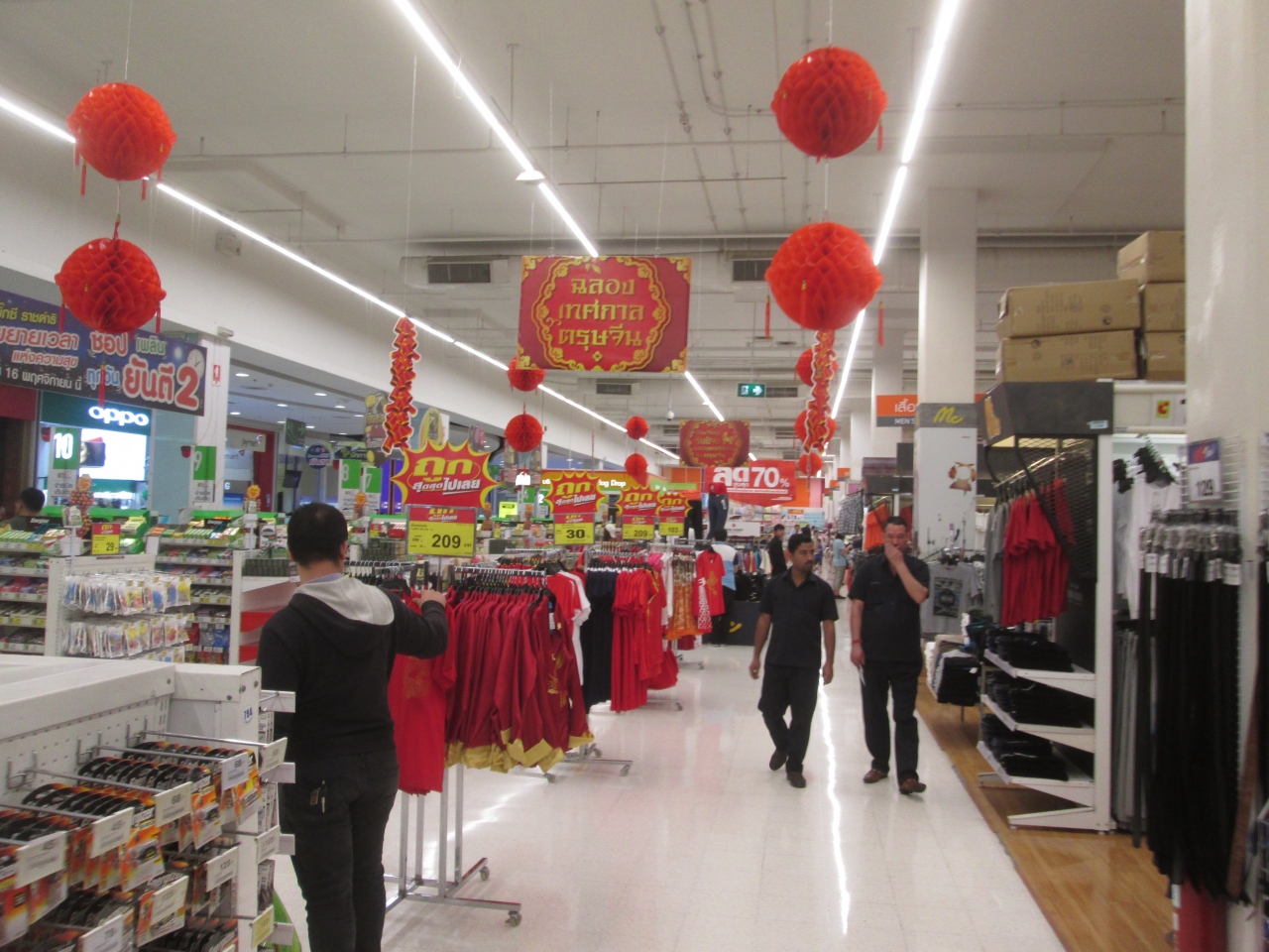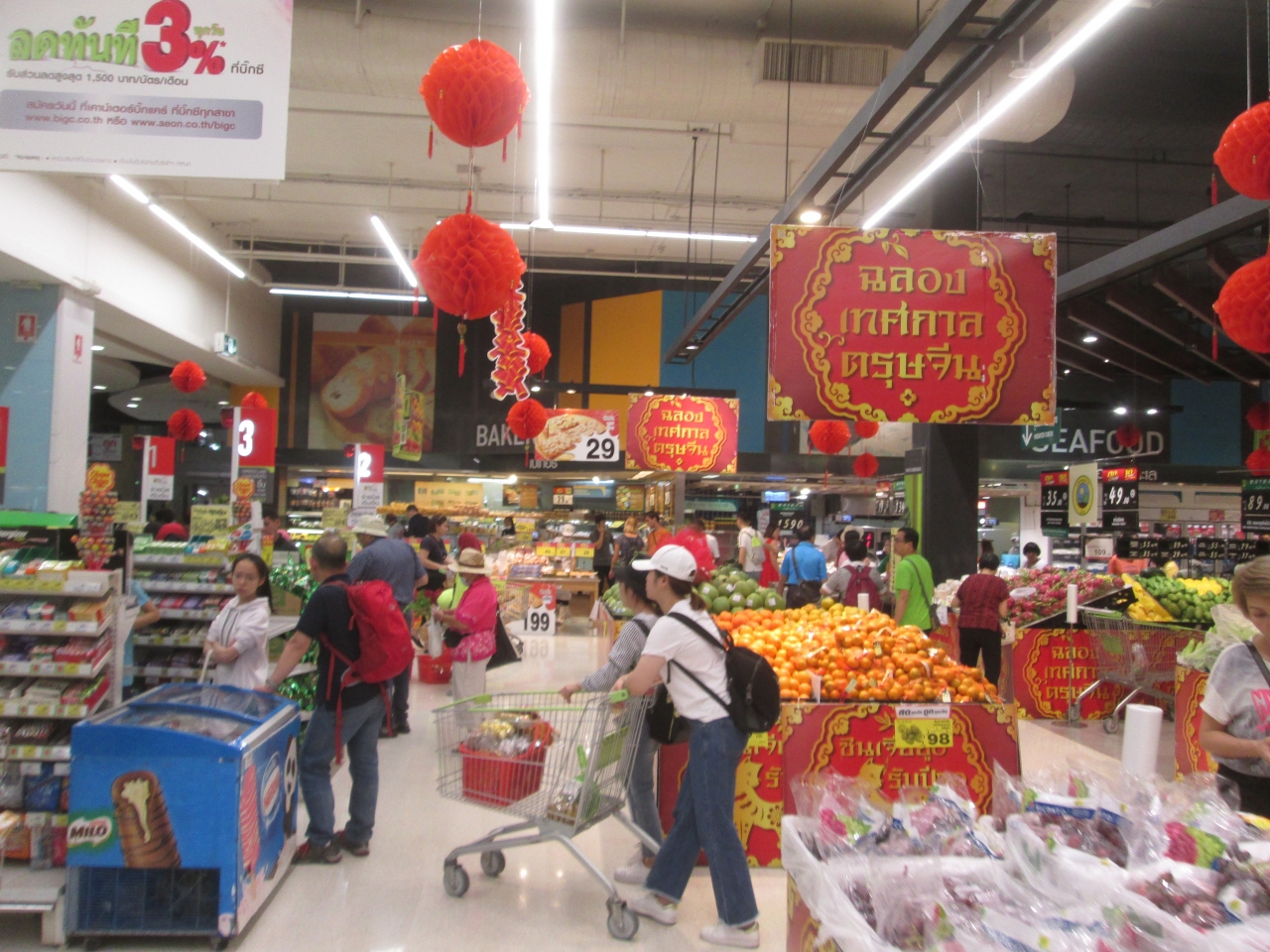 2018年の旧正月は2月15日ということで、旧正月を明後日から迎えるラチャダムリ店のビッグCに訪問しました。ひと足早く休暇を取得したとみられる中国人旅行客を見かけました。エントランスや店内の天井には、赤色を基調にした旧正月を祝う飾りがありました。併設されているスーパーでは旧正月セールを開始していました。