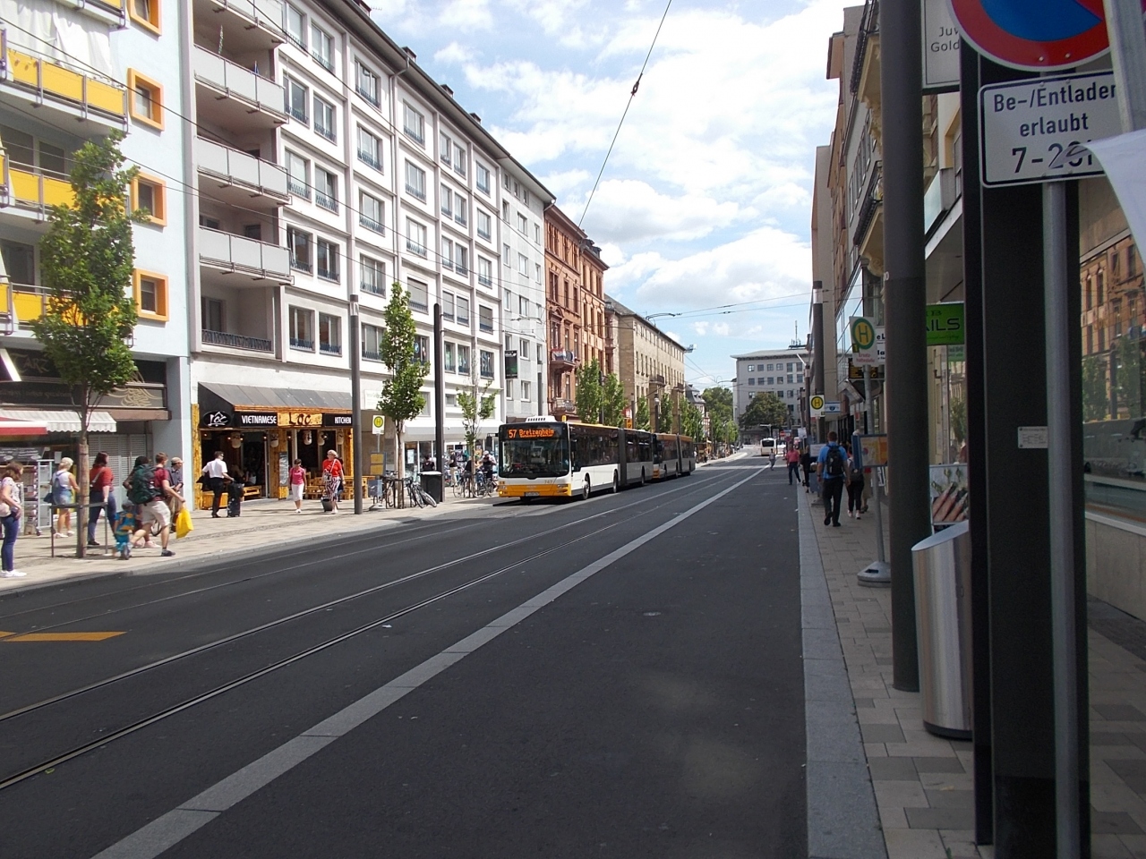 このバーンホーフ通りは旧市街地の西を通っています。マインツ中央駅前から南東に延びる通りです。駅前通りで旧市街地の中心となるマルクト広場に通じる道です。駅前からの道なのでショッピングの店が並んでいます。このバーンホーフ通りの南にはミンスター広場になります。通りは市電が走っています。新しい町並みの通りです。