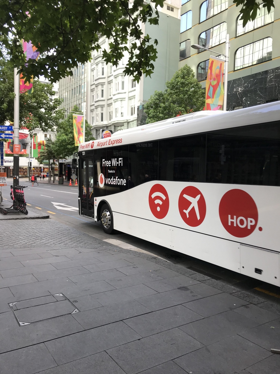 空港から市内まで往復利用しました。チケットは予めネットで購入しておきました。17NZDでした。空港を出てすぐの所に乗り場があり、赤色の案内があるのでわかりやすいです。24時間運行で、便も頻発しているので、ほとんど待たずにすぐに乗車できました。市内までは約40分、車内アナウンスは、英語、中国語、スペイン語の3ヵ国でした。