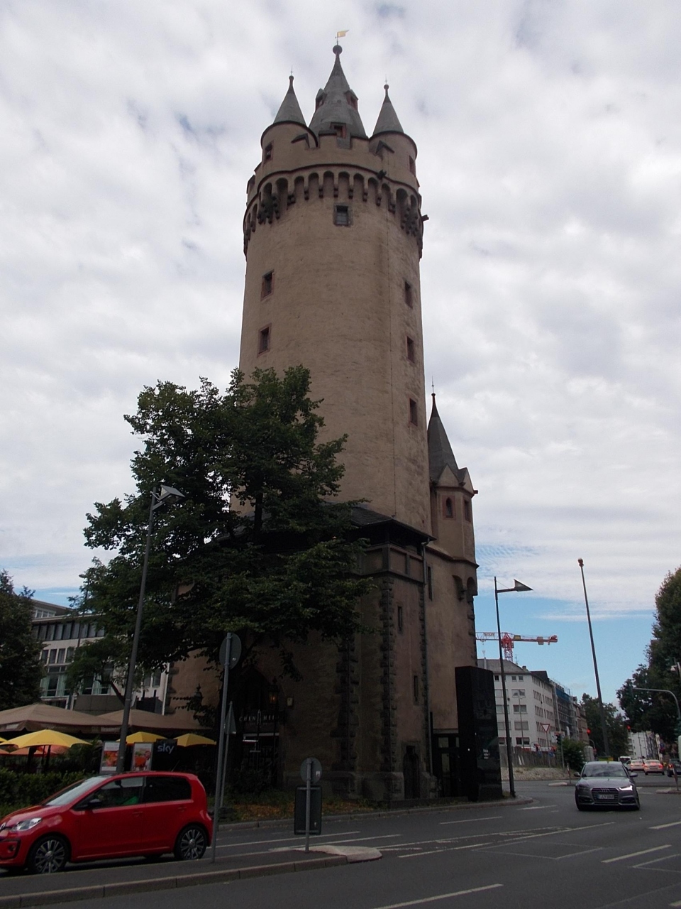 このエッシェンハイマー塔は旧市街地の北側にあります。かつてはフランクフルトにあった城壁にあった塔です。今は城壁はこの北側には残っていません。塔だけが単独で建っています。塔は太く高いです。そこからもフランクフルトの城壁の高さや幅などが推定できます。この塔の周りはレストランなどがありサラリーマンらしい人々が活動しています。