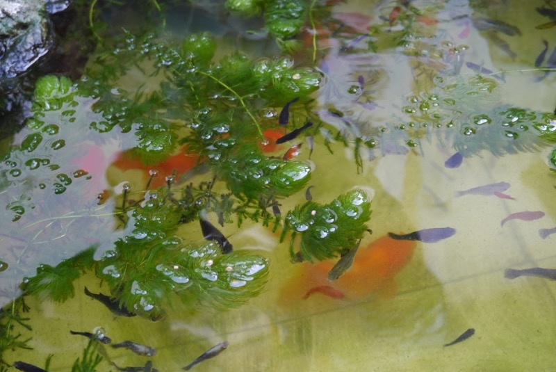 魚、とくにグッピーや金魚あたりが好きな人にはぜひおすすめしたいお寺(?)です。建物の中側へ入ってそのまま奥へ奥へと進み、裏側へいくと池と水槽の中間のような人工池があり、そこで金魚や小魚がたくさん泳いでいます(写真)。金魚はどれもぷりぷりとしていました。