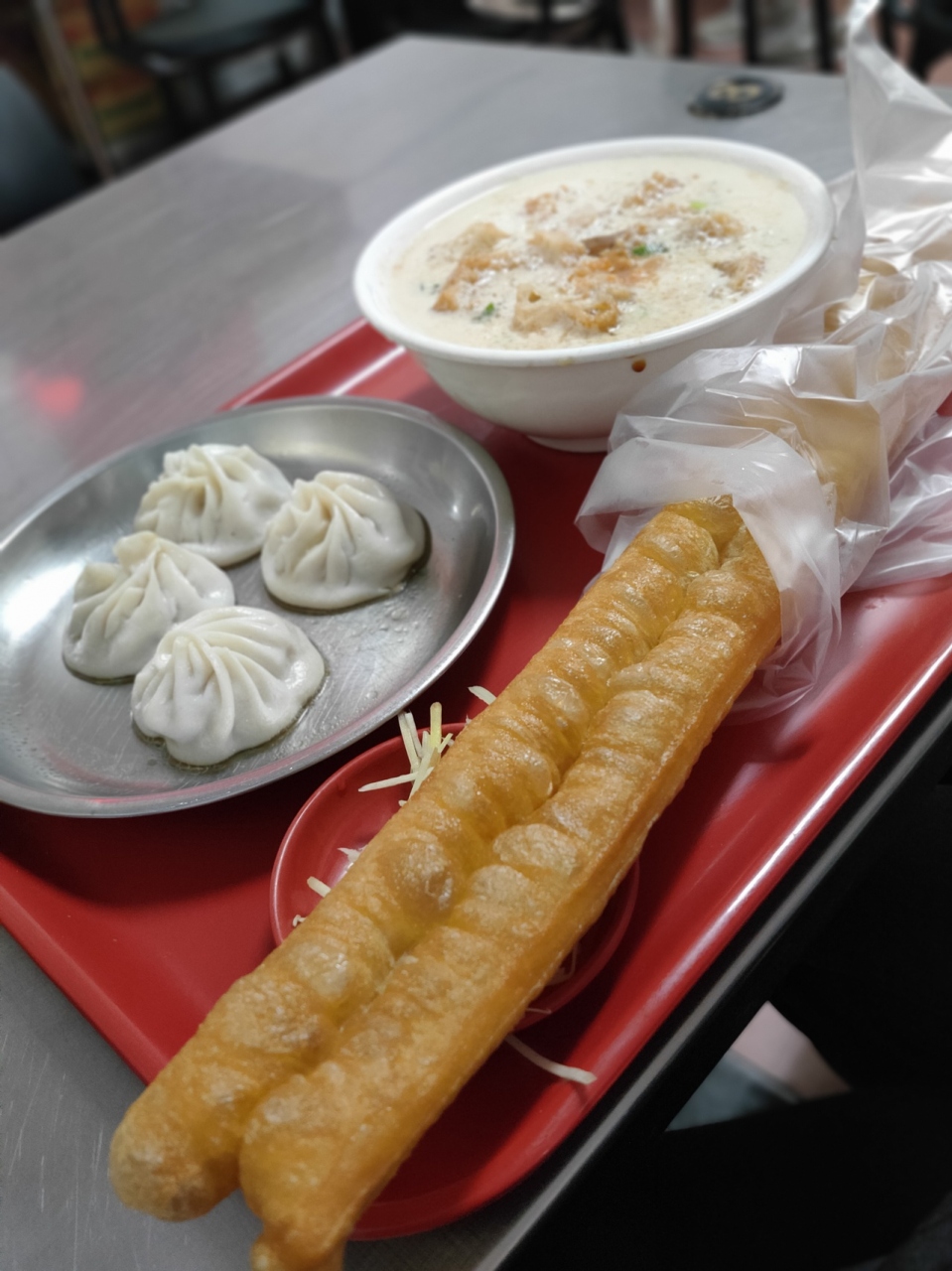温かい豆乳スープに揚げパンをつけて食べるのですが、これがまた美味しい。スープはしっかりと味のついた茶碗蒸しのスープバージョンという感じでした。