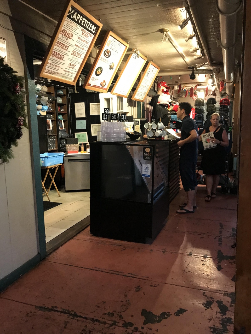 カウンター席の場所では大型TVでスポーツ番組を放映しているので、一日中活気があり、ワーフの中でも一番人気のあるお店です