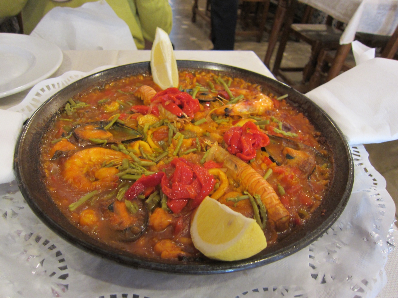 カウンターのあるバーコーナーがあり、その奥に進むとレストランになっていました。パエリアは2人前からの注文です。最初に無料の小皿が出てきました。大きな鉄の皿にドーンと入ったパエリアが登場です。ムール貝やエビがたっぷり入っていました。量がとても多かったです。