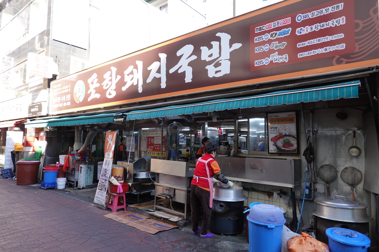 西面にあるテジクッパ通りにお店を構える有名店です。テジクッパとは豚骨スープにご飯を入れたもので、豚の旨味が詰まっています。豚骨特有のニオイは全くしないので、抵抗なく食べられます。塩味がすごーく薄いので、オキアミやニラ等を入れて自分のお好みに調整します。ニラやキムチはセルフで取り放題なので、ニラをたっぷり入れたらとても美味しかったです。